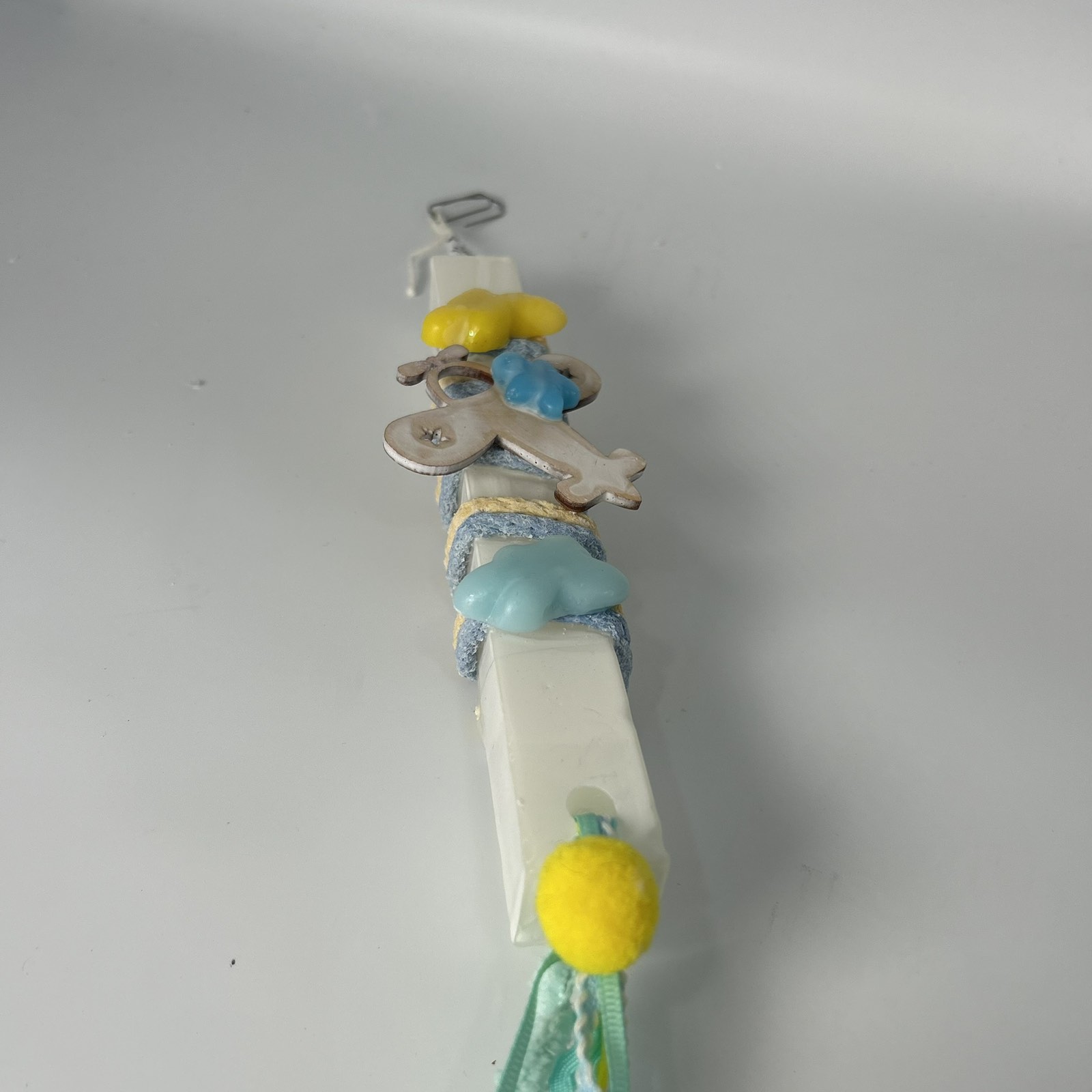 - Κορδέλες: Πολλές κορδέλες σε διάφορα χρώματα, όπως μπλε, κίτρινο, λευκό και ασημί, κρέμονται από το κάτω μέρος της λαμπάδας, προσθέτοντας χρώμα και υφή.