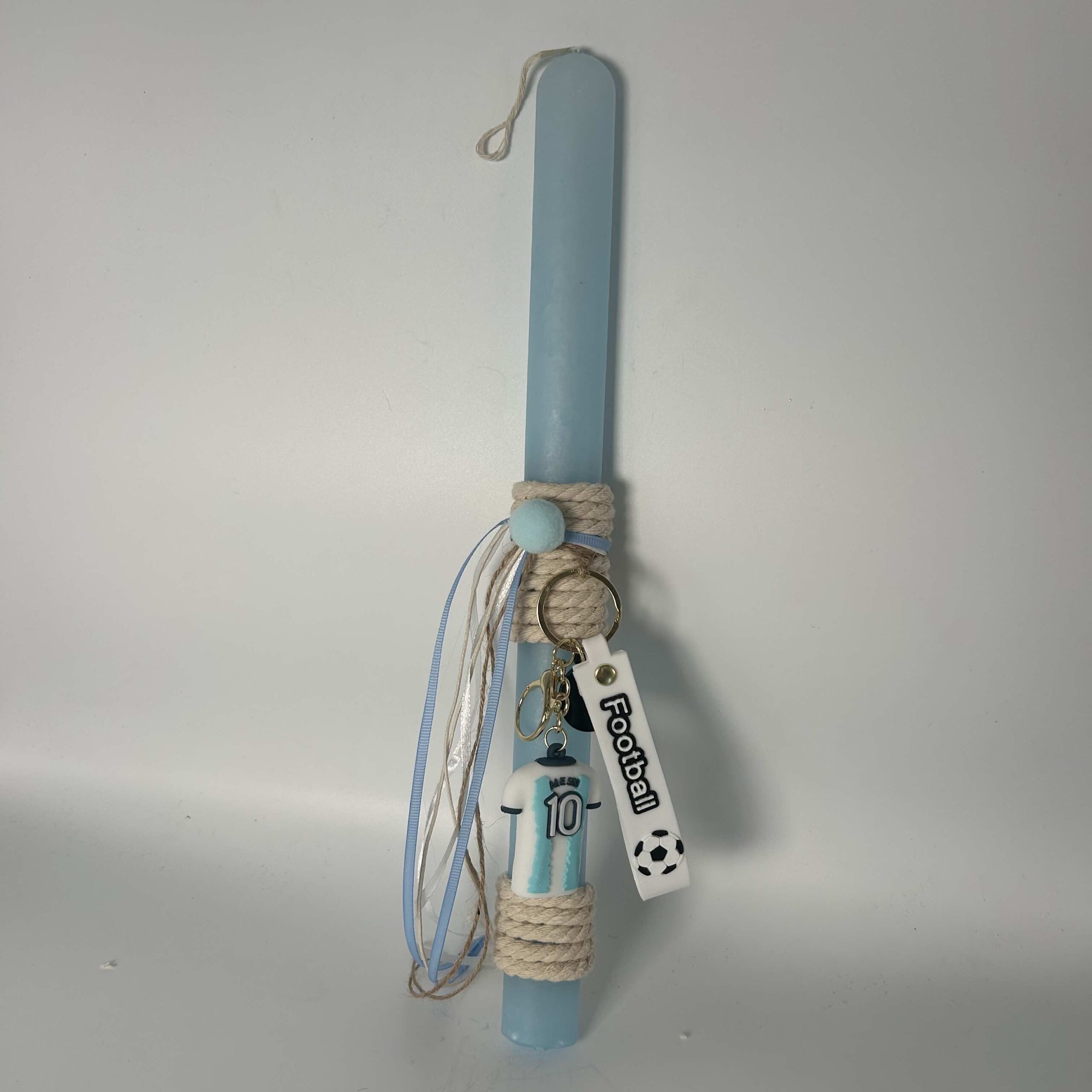 Αυτή η πασχαλινή λαμπάδα είναι γαλάζια και διακοσμημένη με φυσικό σπάγγο και κορδέλες σε μπλε αποχρώσεις. Συνοδεύεται από ένα μπρελόκ με τη φανέλα του Messi και τη λέξη “Football”, καθιστώντας την ιδανική επιλογή για τους λάτρεις του ποδοσφαίρου! ⚽💙