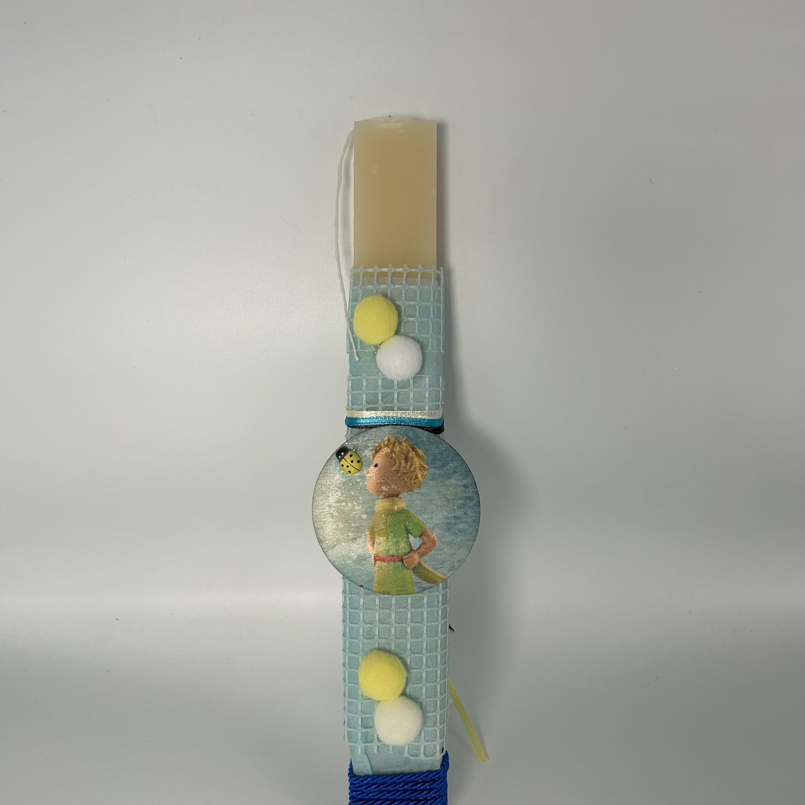 Αυτή η τρυφερή, χειροποίητη πασχαλινή λαμπάδα είναι ιδανική για όσους αγαπούν τον Μικρό Πρίγκιπα και τη φιλοσοφία του. Διακοσμημένη με μια ξύλινη φιγούρα του Μικρού Πρίγκιπα και μια πασχαλίτσα, φέρνει μια δόση παιδικής αθωότητας και στοχασμού στο πασχαλινό τραπέζι. Τα απαλά χρώματα και τα pom-pom προσθέτουν μια επιπλέον πινελιά γλυκύτητας. Κάθε λεπτομέρεια είναι φτιαγμένη με μεράκι, καθιστώντας την ένα ξεχωριστό δώρο που θα ενθουσιάσει κάθε φαν του Μικρού Πρίγκιπα.