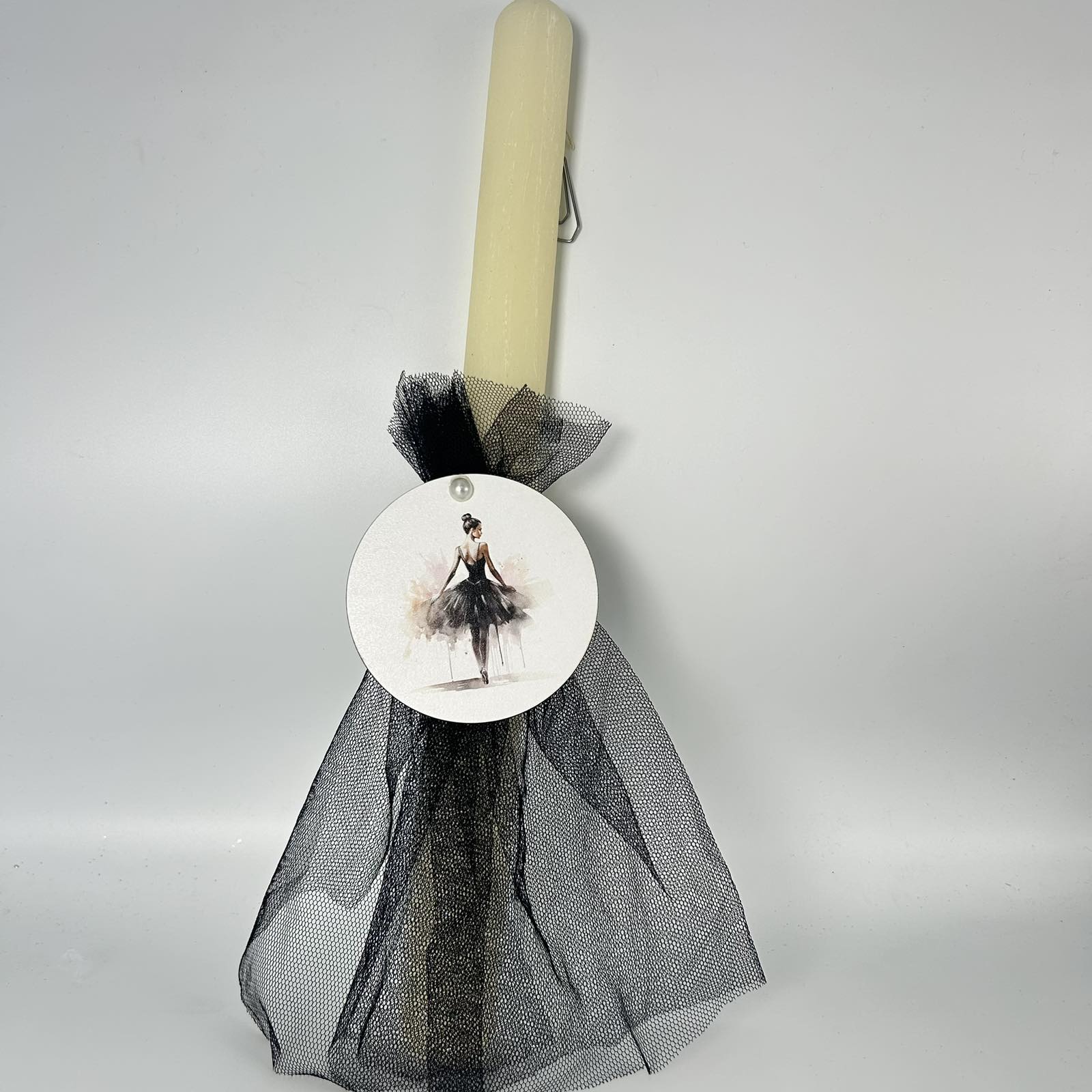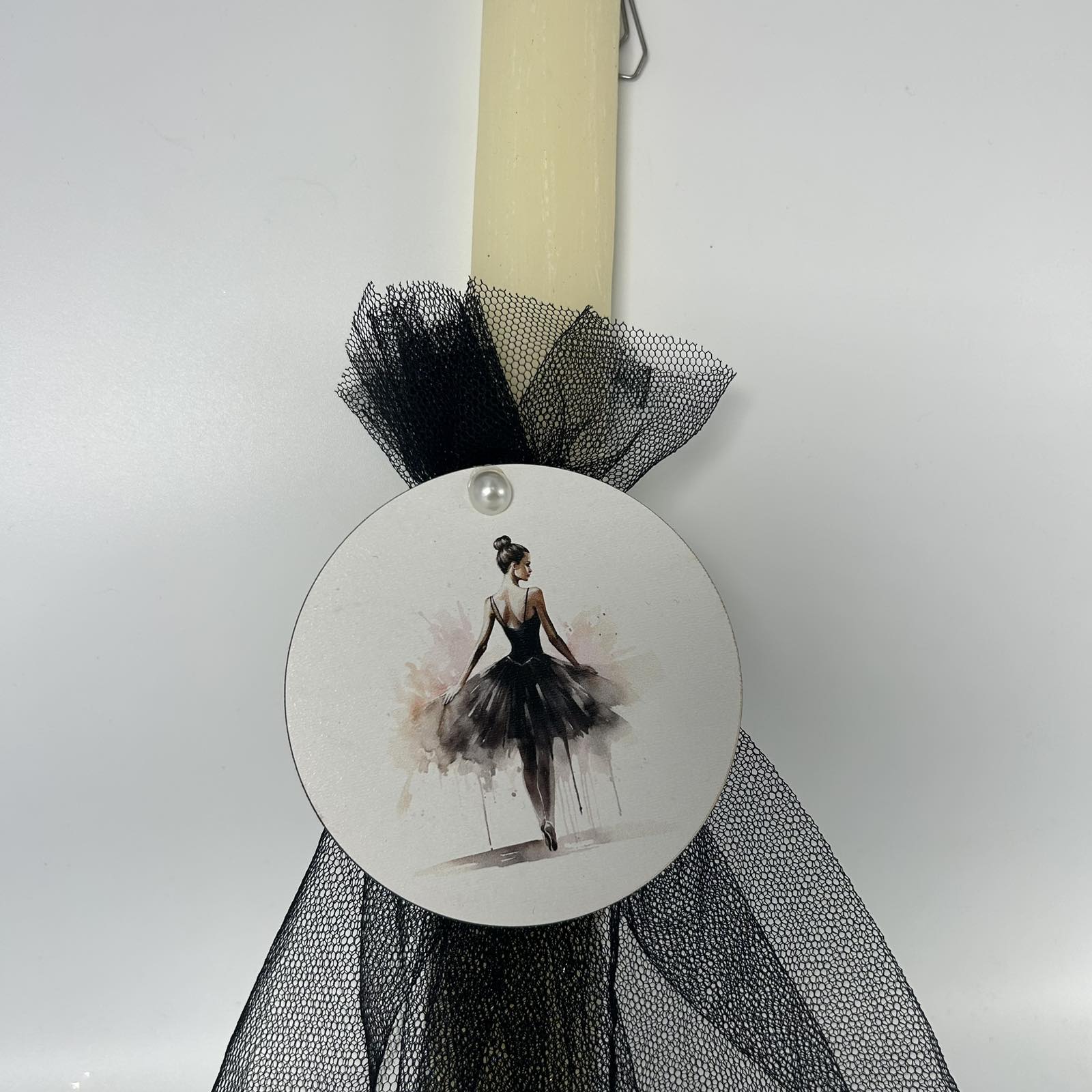 Μια εντυπωσιακή πασχαλινή λαμπάδα εμπνευσμένη από την κομψότητα και τη χάρη του μπαλέτου. Το μαύρο τούλι δημιουργεί την αίσθηση ενός αέρινου φορέματος, ενώ η απεικόνιση μιας μπαλαρίνας προσδίδει καλλιτεχνική φινέτσα. Ένα μοναδικό δώρο για όσους αγαπούν τη χορευτική τέχνη και την κλασική ομορφιά! 🩰🎭