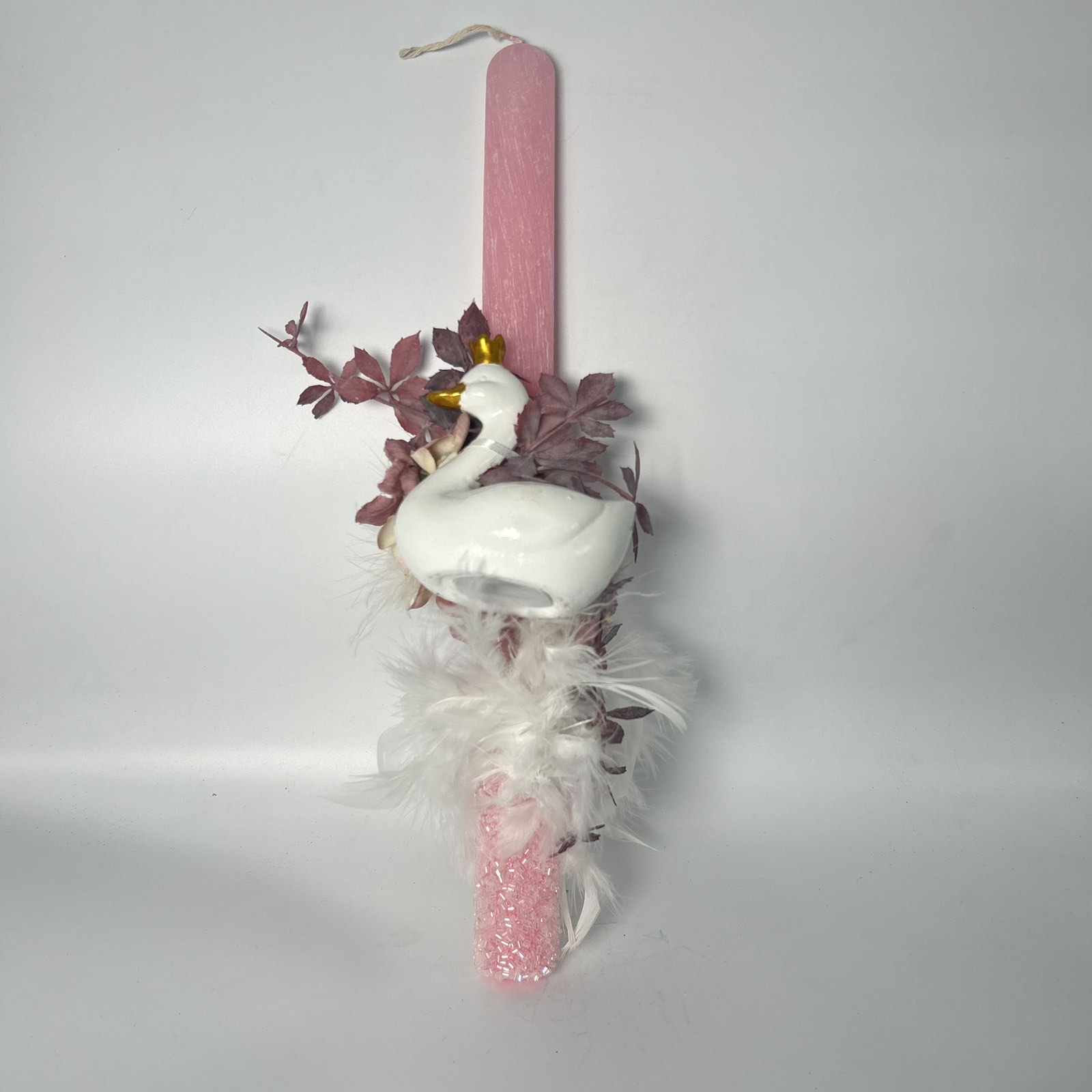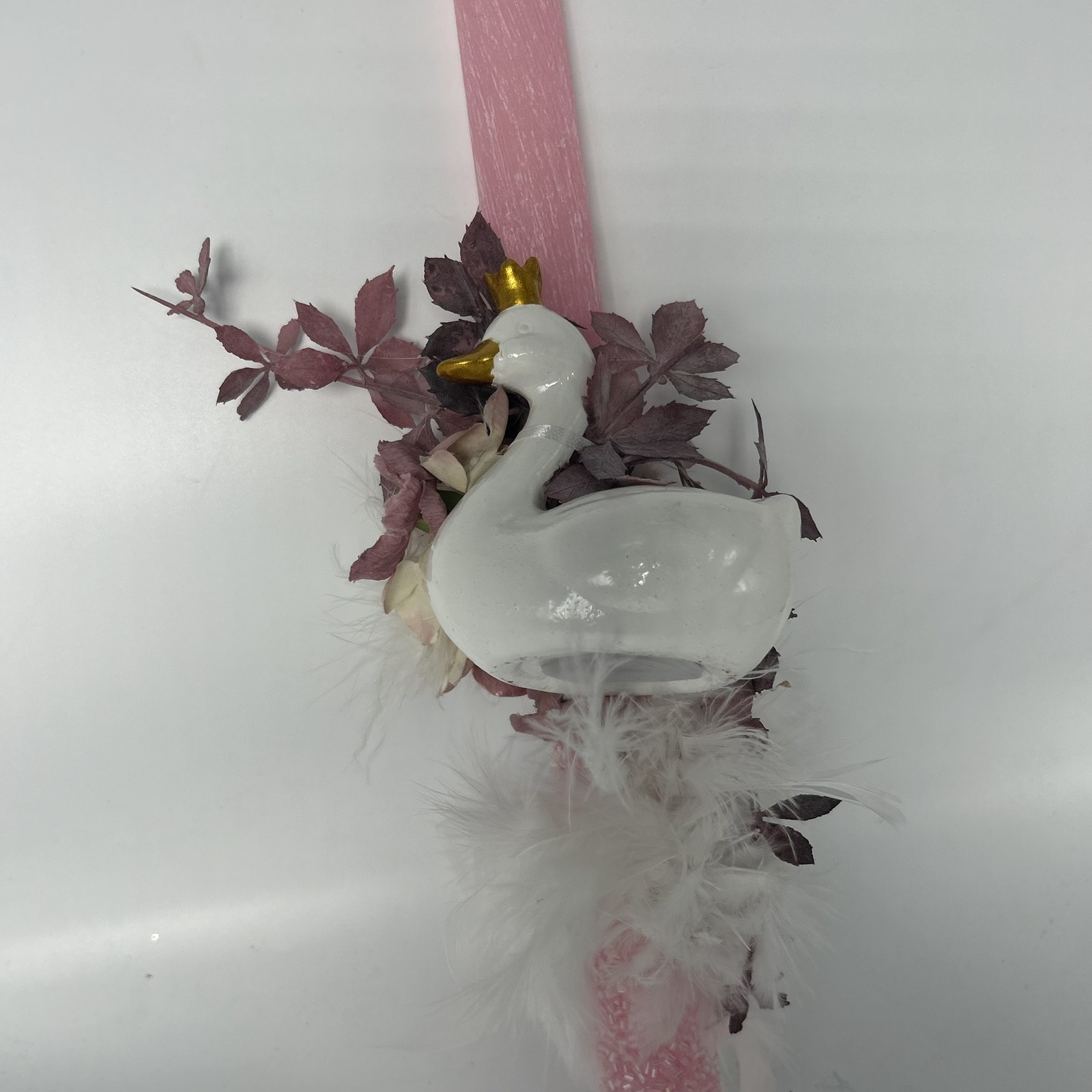 Αυτή η κομψή χειροποίητη πασχαλινή λαμπάδα διαθέτει ροζ κερί και είναι διακοσμημένη με έναν λευκό κεραμικό κύκνο με χρυσές λεπτομέρειες. Συμπληρώνεται από ροζ αποξηραμένα φύλλα και απαλά λευκά φτερά, προσδίδοντας μια ρομαντική και αριστοκρατική αισθητική. Ιδανική για όσους αγαπούν το ρομαντικό και παραμυθένιο στυλ!