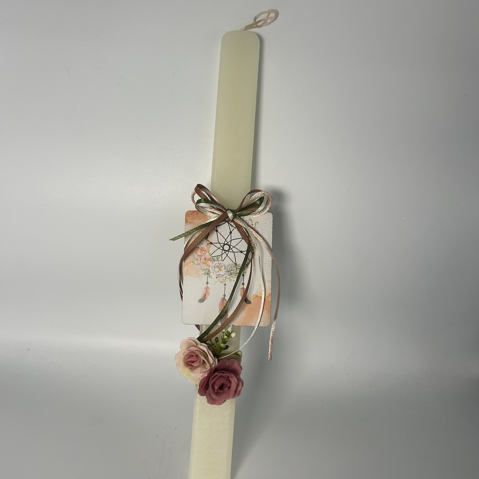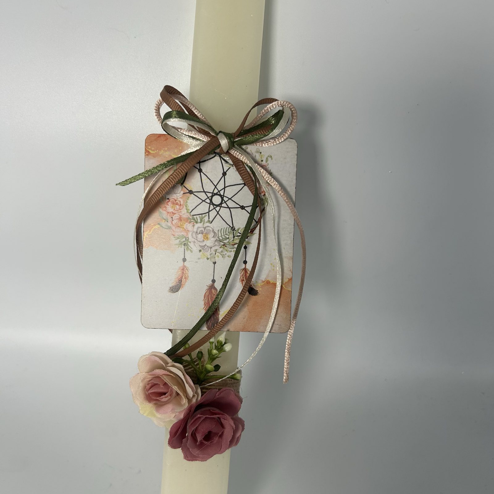 Αυτή η ρομαντική, χειροποίητη πασχαλινή λαμπάδα είναι ιδανική για όσους αγαπούν τα όνειρα και τη boho αισθητική. Διακοσμημένη με ένα σχέδιο ονειροπαγίδας σε απαλά χρώματα, φέρνει μια δόση μαγείας και γαλήνης στο πασχαλινό τραπέζι. Οι κορδέλες σε γήινους τόνους και τα υφασμάτινα λουλούδια προσθέτουν μια επιπλέον πινελιά ρομαντισμού. Κάθε λεπτομέρεια είναι φτιαγμένη με μεράκι, καθιστώντας την ένα ξεχωριστό δώρο που θα φέρει όμορφα όνειρα και θετική ενέργεια σε όποιον την κρατά.