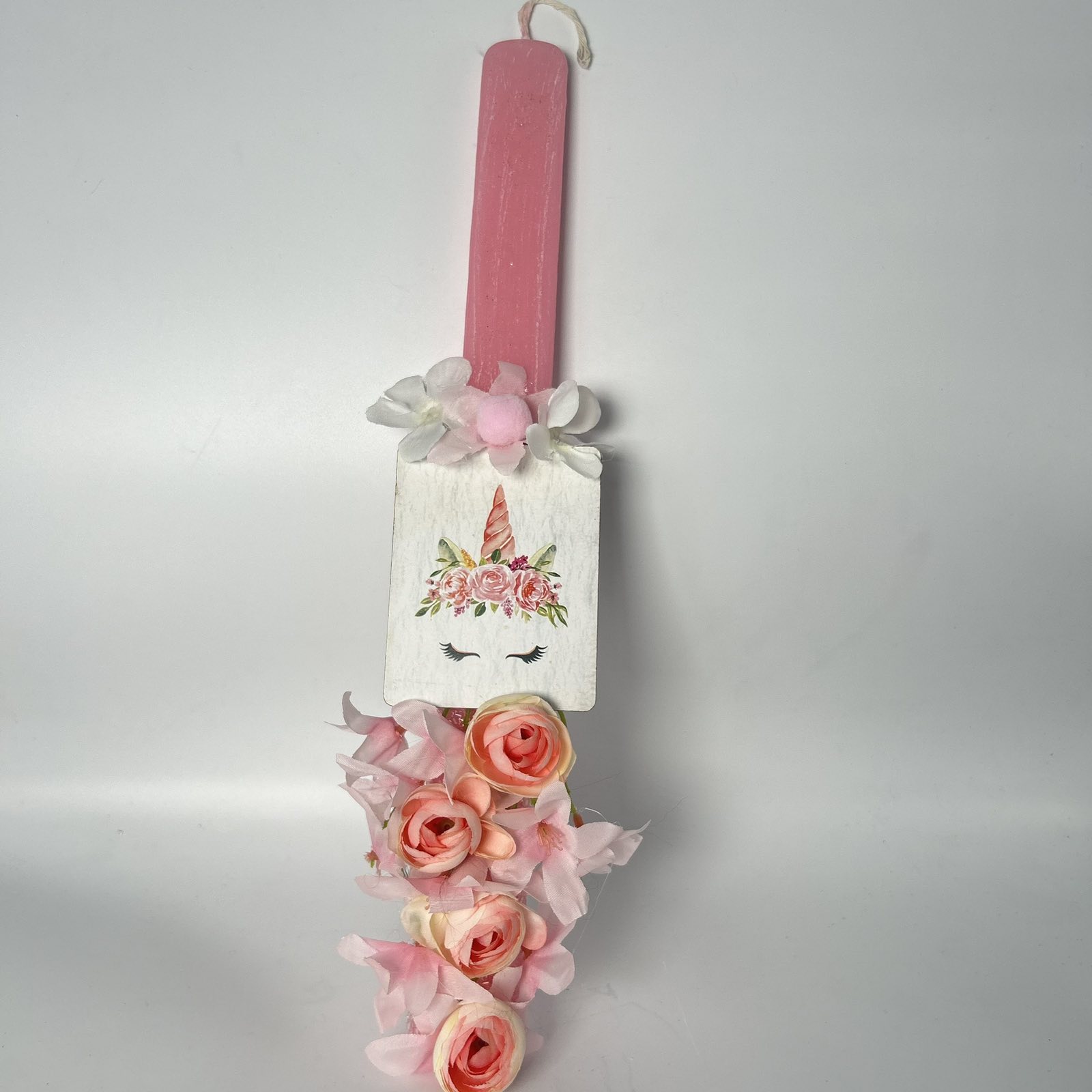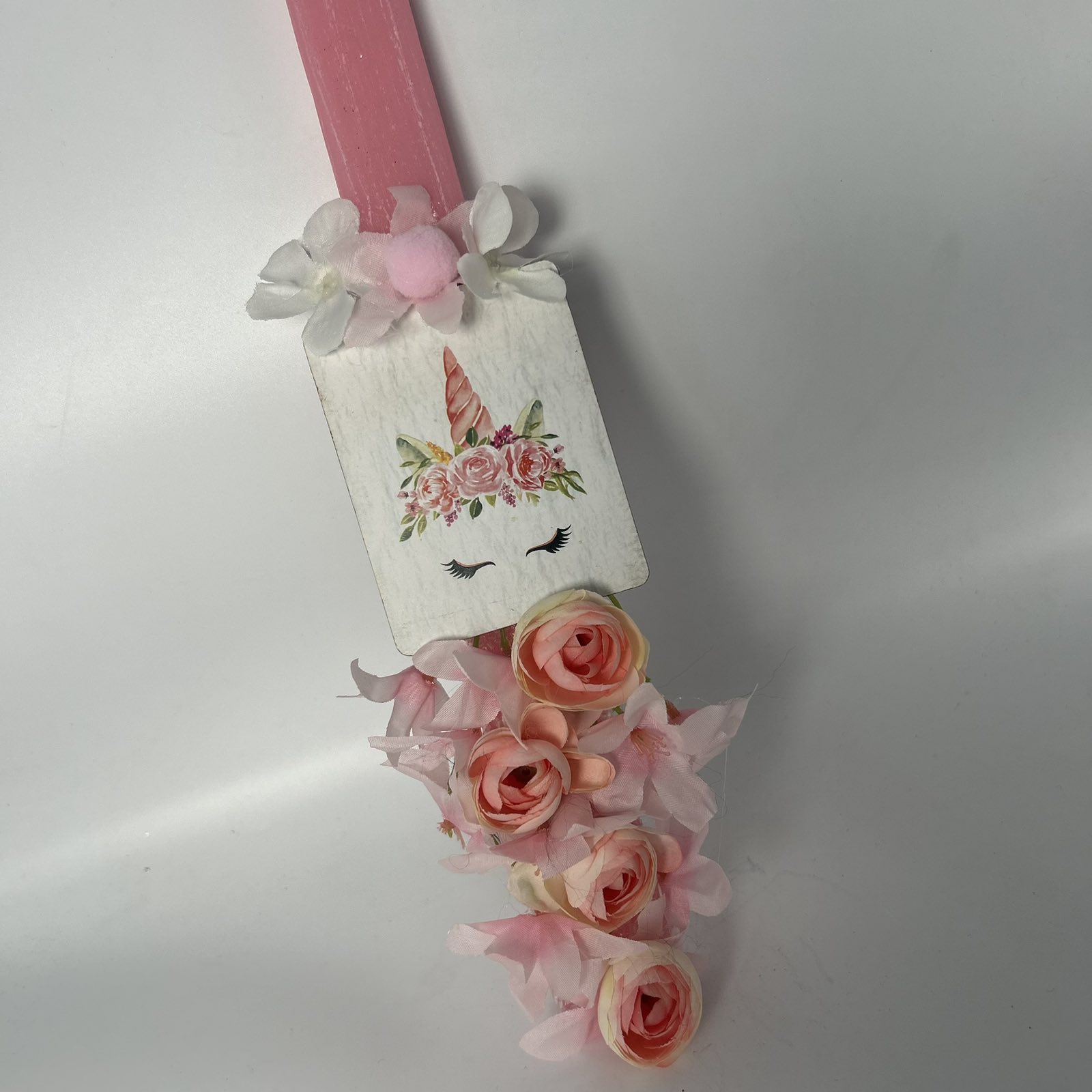 Αυτή η ρομαντική χειροποίητη πασχαλινή λαμπάδα είναι διακοσμημένη με ένα ξύλινο στοιχείο που απεικονίζει έναν μονόκερο με λουλουδένιο στεφάνι. Το ροζ κερί συμπληρώνεται από υφασμάτινα άνθη σε απαλές αποχρώσεις του ροζ και του λευκού, δημιουργώντας μια ονειρική και παραμυθένια αισθητική. Ιδανική για όσους λατρεύουν τη μαγεία και τα παραμύθια!