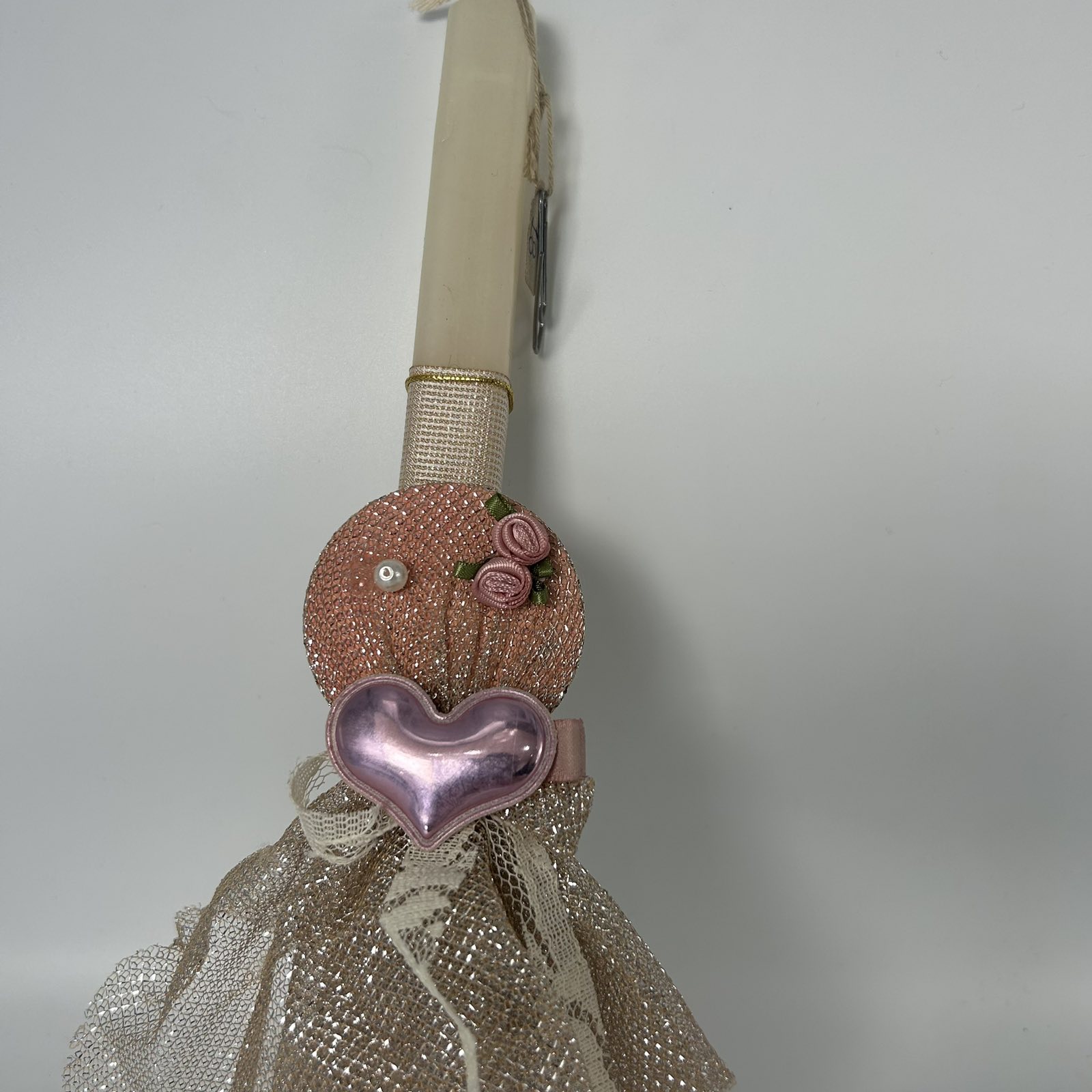 Η λαμπάδα είναι φτιαγμένη με προσοχή στη λεπτομέρεια και συνδυάζει στοιχεία ρομαντικά, λαμπερά και κομψά. Το κυκλικό στοιχείο με τα τριαντάφυλλα και την πέρλα, η καρδιά και το τούλι δημιουργούν ένα γλυκό και ρομαντικό σύνολο. Είναι ιδανική για ένα κορίτσι ή μια γυναίκα που εκτιμά τα ρομαντικά και κομψά δώρα.