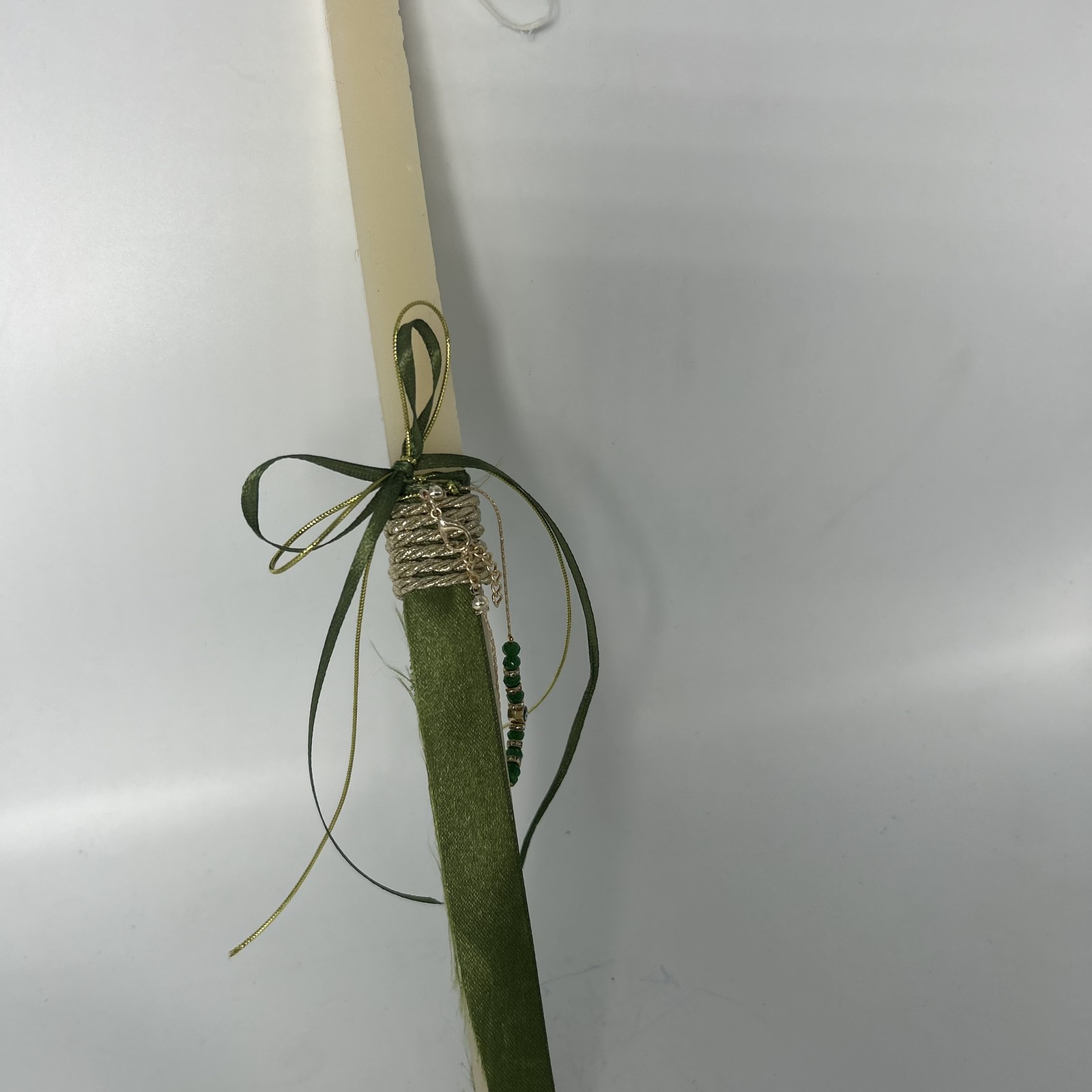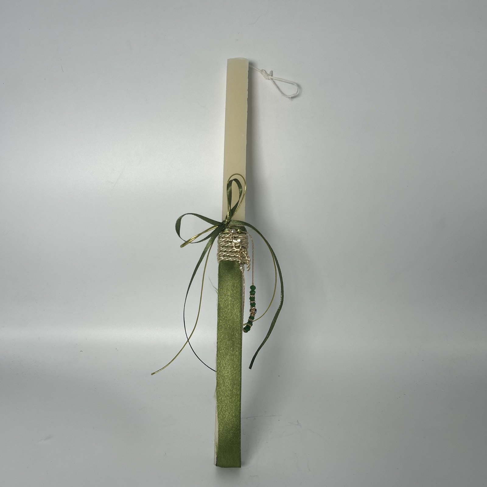 Λευκή πασχαλινή λαμπάδα διακοσμημένη με πράσινη κορδέλα, χρυσό σύρμα και χάντρες.