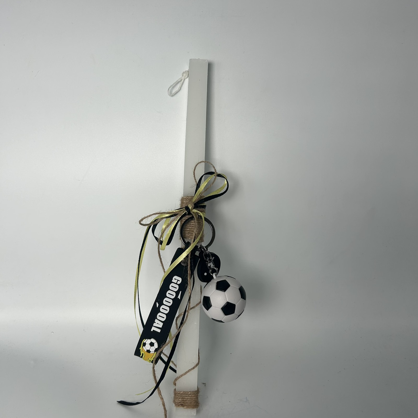 Αυτή η πασχαλινή λαμπάδα είναι η ιδανική επιλογή για τους μικρούς και μεγάλους φίλους του ποδοσφαίρου. Το λευκό κερί της είναι στολισμένο με ένα κορδόνι από σχοινί, δημιουργώντας μια ρουστίκ αίσθηση. Το δώρο της λαμπάδας περιλαμβάνει ένα μπρελόκ με την επιγραφή “GOOOOAL” και μια ποδοσφαιρική μπάλα, προσθέτοντας μια παιχνιδιάρικη και αθλητική πινελιά. Είναι το τέλειο δώρο για να γιορτάσετε το Πάσχα με πάθος για το αγαπημένο σας άθλημα!