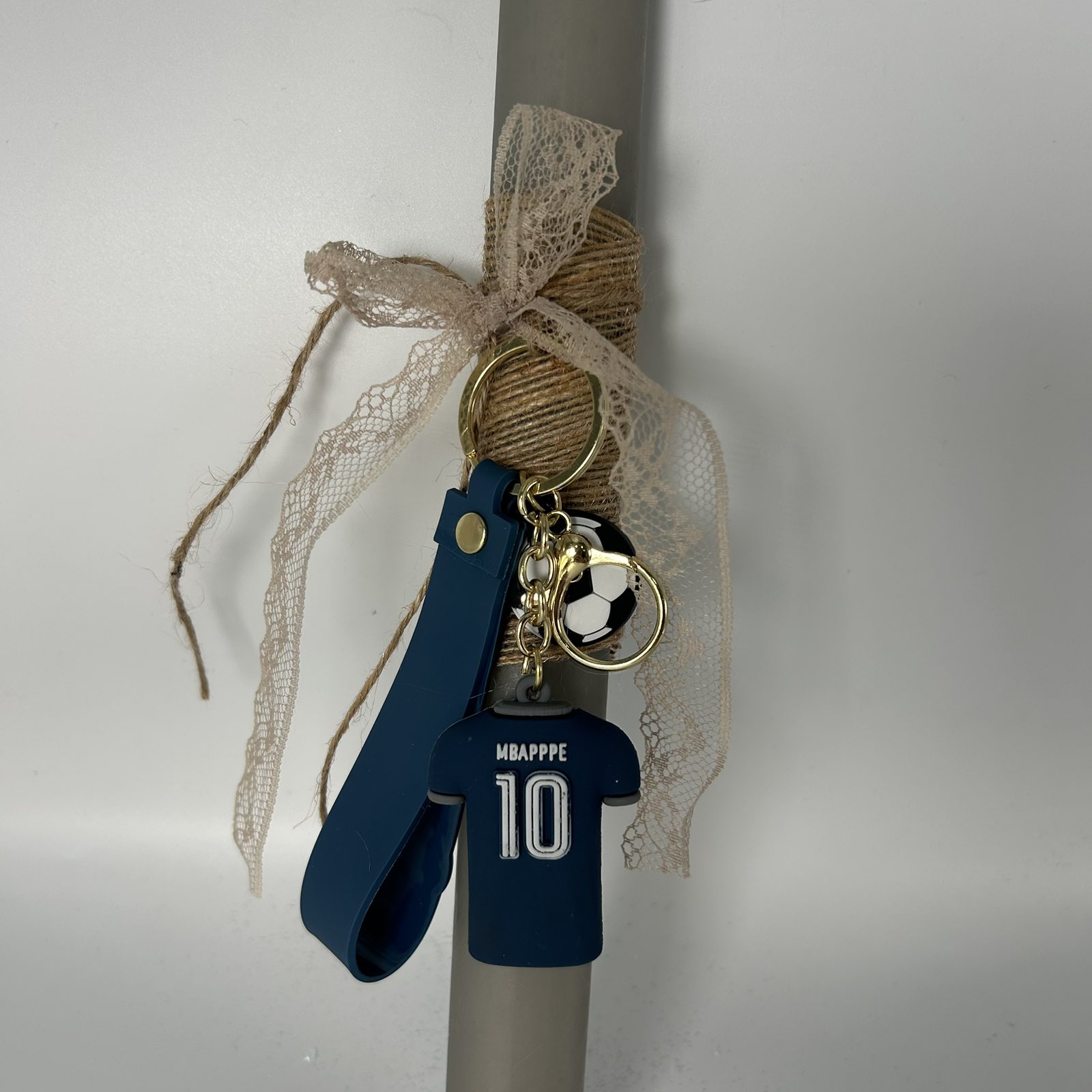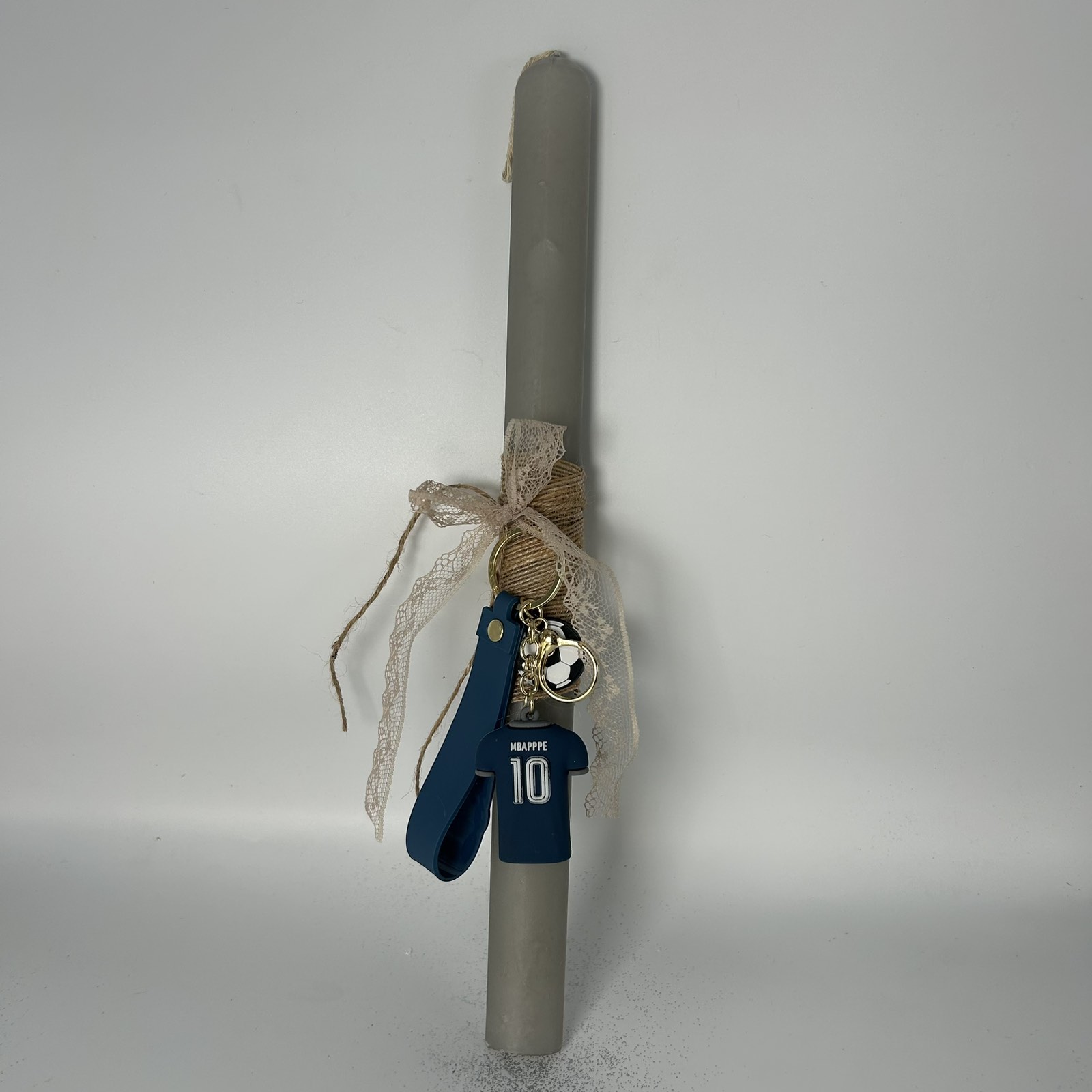 Για τους λάτρεις του ποδοσφαίρου, αυτή η γκρι λαμπάδα διαθέτει μπρελόκ φανέλας “Mbappé 10” και διακοσμητικά ποδοσφαίρου. Μια τέλεια επιλογή για τους φαν του γαλλικού άσσου και του αθλήματος! 🌟🏆