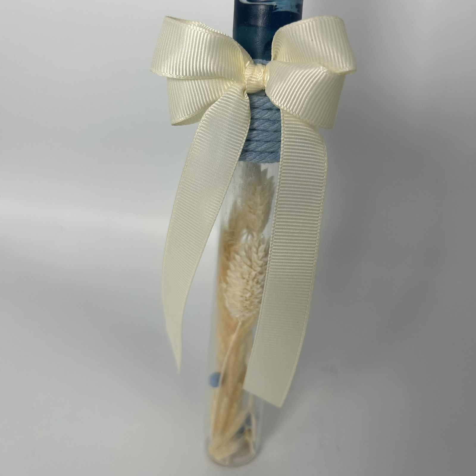 Μια εντυπωσιακή πασχαλινή λαμπάδα σε σκούρο μπλε χρώμα, διακοσμημένη με σχέδια που θυμίζουν κύματα και αφρούς, δημιουργώντας μια αίσθηση βάθους και κίνησης. Η λευκή κορδέλα με τον φιόγκο και το μικρό γυάλινο σωλήνα που περιέχει αποξηραμένα στοιχεία της θάλασσας, όπως άμμο και κοχύλια, προσθέτουν μια ναυτική πινελιά. Το σχοινί γύρω από τη λαμπάδα και το διακριτικό κρεμαστό στοιχείο συμπληρώνουν αρμονικά την αισθητική της. Ιδανική για όσους αγαπούν τη θάλασσα και την περιπέτεια, αυτή η λαμπάδα αποτελεί ένα ξεχωριστό πασχαλινό δώρο που συνδυάζει την παράδοση με τη φυσική ομορφιά.