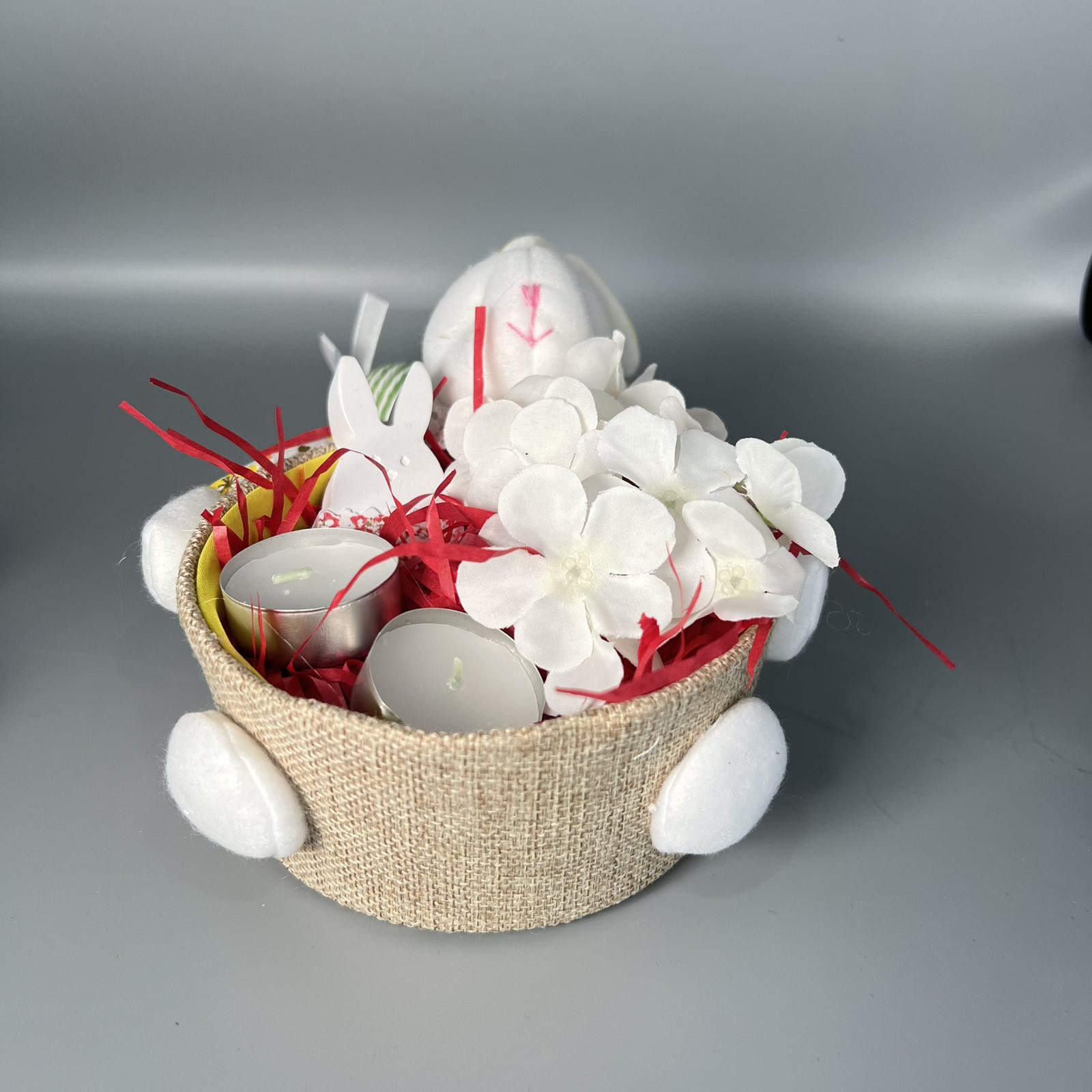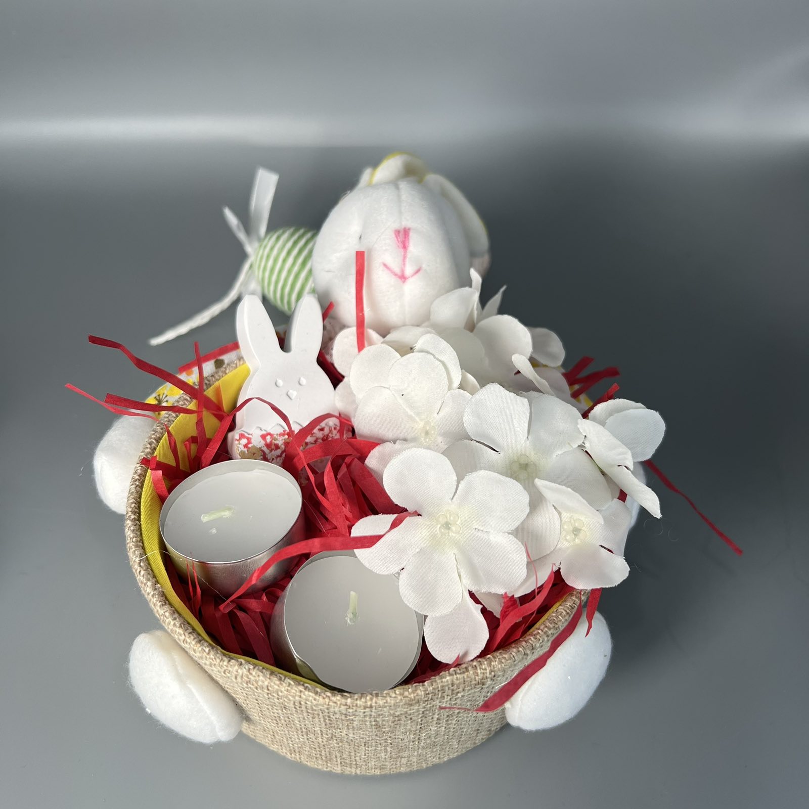 Ένα γιορτινό πασχαλινό καλάθι γεμάτο εκπλήξεις! Με διακοσμητικά λαγουδάκια, αρωματικά κεριά, απαλά λουλούδια και ζωηρές κόκκινες πινελιές, είναι το τέλειο δώρο για να χαρίσετε ευχές αγάπης και ανανέωσης.