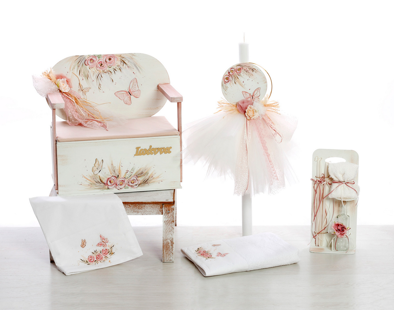 - Ένα μαγευτικό σετ βάπτισης με ξύλινο μπαούλο-καρέκλα, λαμπάδα, λαδόπανα και σετ λαδιού, διακοσμημένο με πεταλούδες, λουλούδια, ροζ τούλι και δαντέλα, με το όνομα “Ιωάννα”. Ιδανικό για μια γλυκιά και παραμυθένια βάπτιση.