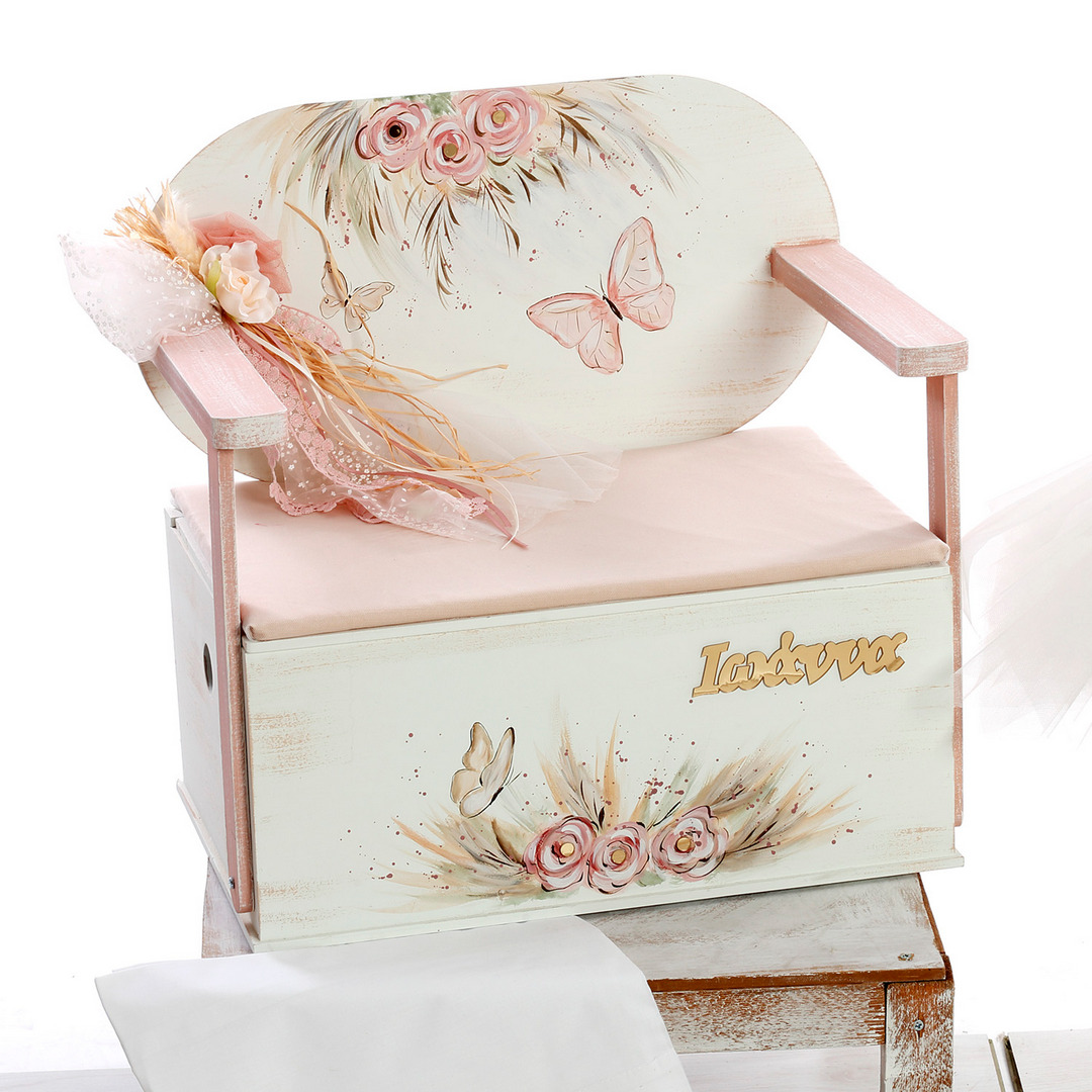 - Ένα ξύλινο μπαούλο-καρέκλα βάπτισης, διακοσμημένο με πεταλούδες, λουλούδια, το όνομα “Ιωάννα”, ροζ τούλι και δαντέλα, που θα αποθηκεύσει με στυλ τα βαπτιστικά ρούχα και θα αποτελέσει ένα όμορφο διακοσμητικό για το παιδικό δωμάτιο.