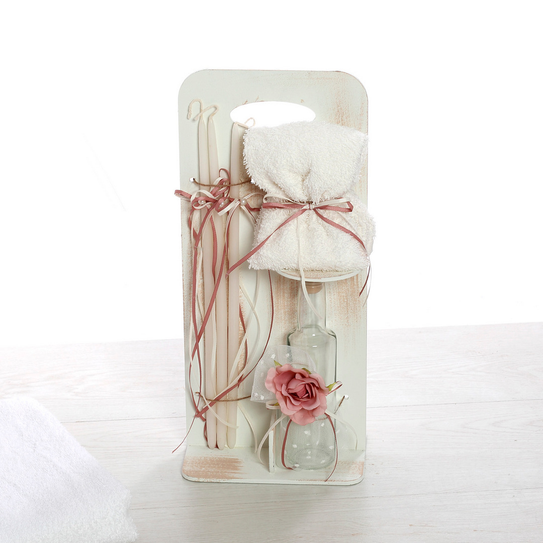- Ένα σετ λαδιού με μπουκάλι λαδιού, σαπούνι και κεράκια, διακοσμημένα με ροζ κορδέλες και λουλούδια.