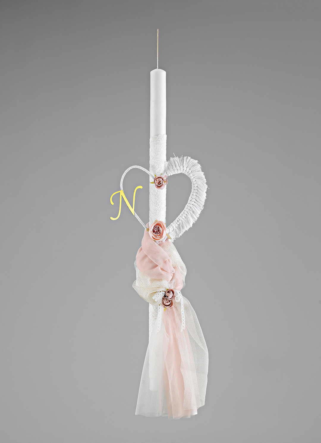 Μια ξεχωριστή λαμπάδα βάπτισης που αποπνέει ρομαντισμό και κομψότητα. Η λευκή λαμπάδα είναι διακοσμημένη με ένα όμορφο καρδιόσχημο διακοσμητικό στο πλάι, τυλιγμένο με δαντέλα και κορδόνι, προσδίδοντας έναν αριστοκρατικό χαρακτήρα. Το σύνολο συμπληρώνουν υφασμάτινα τριαντάφυλλα σε παστέλ αποχρώσεις του ροζ και του λευκού, καθώς και φίνα τούλινα υφάσματα που χαρίζουν μια αέρινη αίσθηση. Η προσθήκη του αρχικού γράμματος προσφέρει μια προσωπική πινελιά, καθιστώντας τη λαμπάδα μοναδική και ιδανική για μια ρομαντική και κομψή βάπτιση.