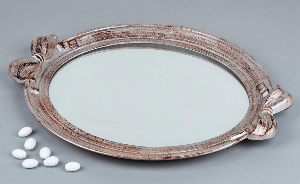 Ο συγκεκριμένος δίσκος γάμου είναι η επιτομή της ρομαντικής κομψότητας, με ένα εκλεπτυσμένο, παλαιωμένο φινίρισμα σε πατίνα, που του προσδίδει μια νοσταλγική και vintage αισθητική. Η οβάλ επιφάνειά του είναι καθρέφτης, δημιουργώντας μια αίσθηση πολυτέλειας και αντανάκλασης του φωτός, ενώ οι διακοσμητικοί φιόγκοι στις άκρες προσθέτουν μια διακριτική, αλλά εντυπωσιακή λεπτομέρεια. Ένας ιδανικός δίσκος για ζευγάρια που αγαπούν την κλασική ομορφιά και επιθυμούν μια ξεχωριστή πινελιά στην πιο ιδιαίτερη στιγμή της ζωής τους.