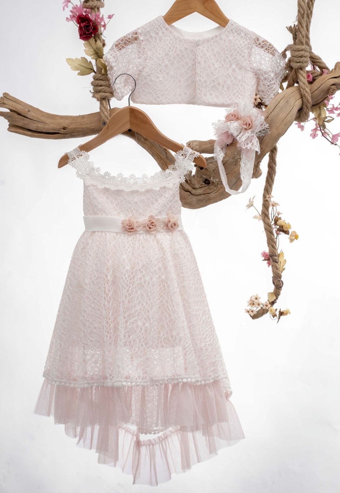 Ένα υπέροχο βαπτιστικό φόρεμα για κορίτσι σε παστέλ ροζ απόχρωση, διακοσμημένο με φίνα δαντέλα, διακριτικές λεπτομέρειες από τούλι και ζώνη με χειροποίητα λουλούδια.