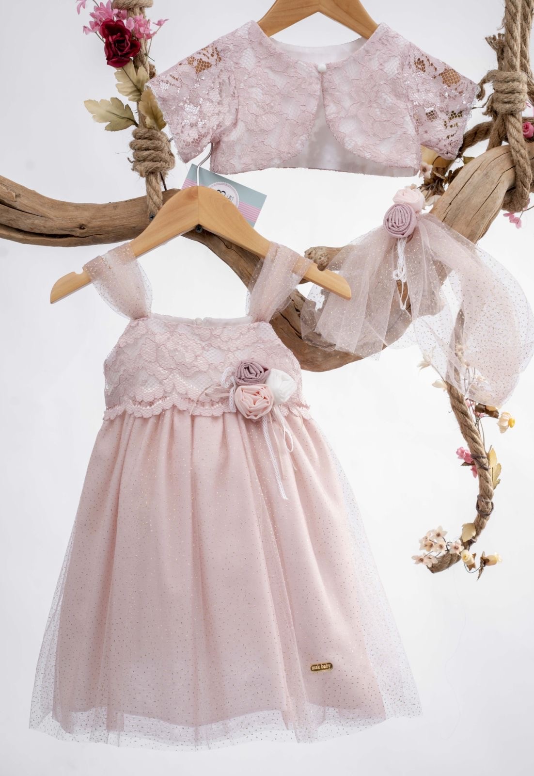 Το σύνολο συμπληρώνεται από ένα ασορτί μπολερό με λεπτομέρειες από δαντέλα, καθώς και μια κορδέλα μαλλιών στολισμένη με τριαντάφυλλα και τούλι, δημιουργώντας μια ολοκληρωμένη εμφάνιση που θα κάνει κάθε μικρή πριγκίπισσα να ξεχωρίσει στην ημέρα της βάπτισής της.