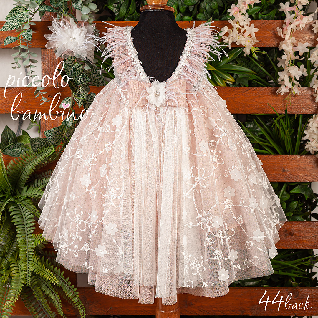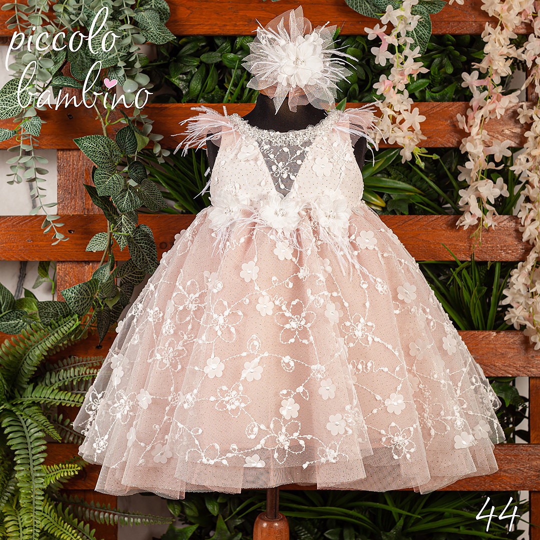 Αυτό το παραμυθένιο βαπτιστικό φόρεμα αποπνέει κομψότητα και ρομαντισμό, ιδανικό για μια ξεχωριστή ημέρα. Η βάση του σε απαλό σάπιο μήλο δημιουργεί μια ζεστή και φίνα αίσθηση, ενώ η πλούσια τούλινη επικάλυψη είναι στολισμένη με υπέροχα 3D λουλούδια από φίνα δαντέλα, δίνοντας μια αίσθηση πολυτέλειας.