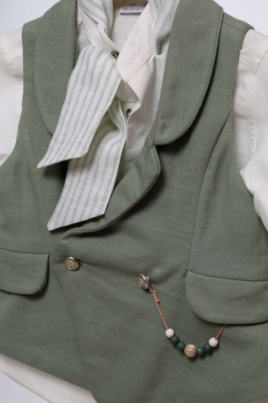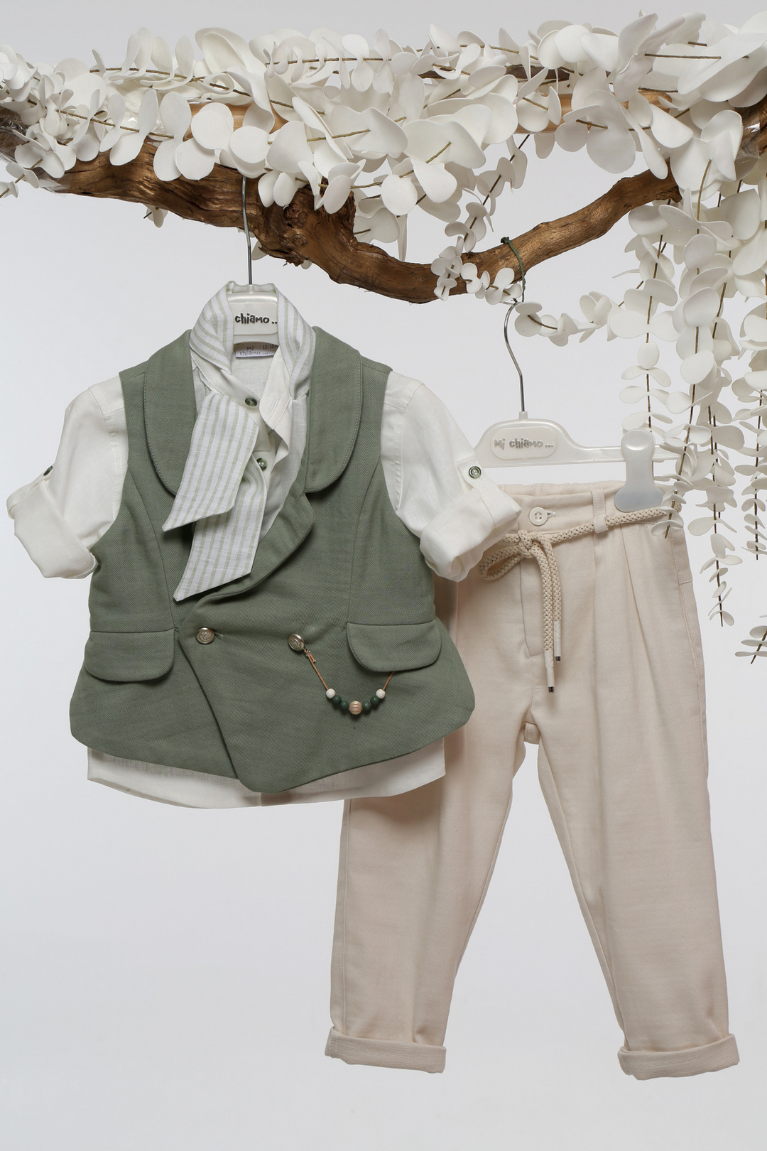 Αυτό το υπέροχο βαπτιστικό σύνολο για αγόρι συνδυάζει την κλασική κομψότητα με μια ρουστίκ αισθητική, καθιστώντας το ιδανικό για τη σημαντική ημέρα της βάπτισης. Το γιλέκο, σε μια απαλή λαδί απόχρωση, διαθέτει διακριτική υφή και κουμπιά, προσφέροντας στυλ και κομψότητα. Το λευκό πουκάμισο, με τα μανίκια που μπορούν να διπλωθούν, προσθέτει μια πινελιά φρεσκάδας, ενώ το ριγέ παπιγιόν ολοκληρώνει το look με μια ρουστίκ γοητεία. Το μπεζ παντελόνι, σε αρμονική απόχρωση, είναι σχεδιασμένο για να προσφέρει άνεση καθ’ όλη τη διάρκεια της ημέρας.