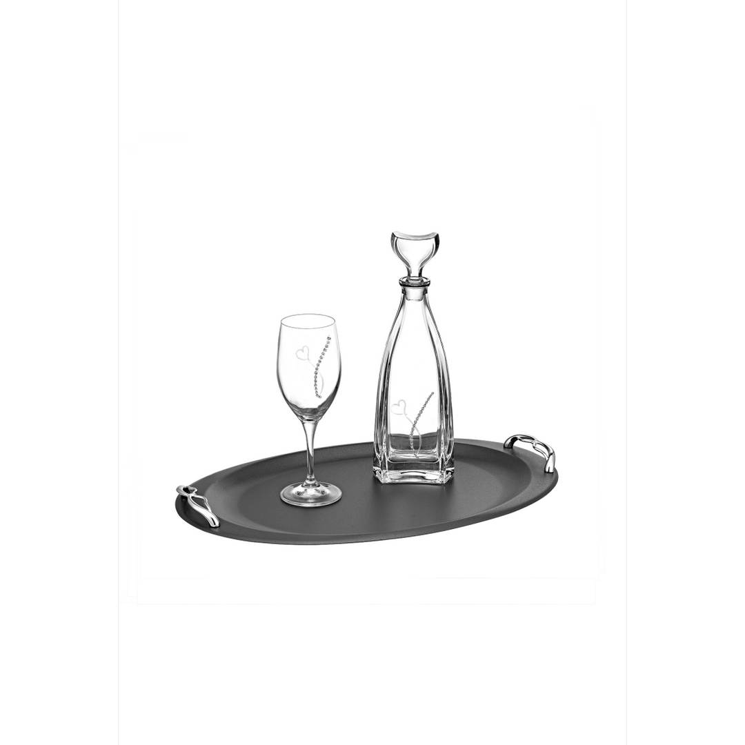 Ένα ρομαντικό σετ κουμπάρου με χαραγμένη καρδιά σε καράφα και ποτήρι, που περιλαμβάνει έναν μαύρο οβάλ δίσκο. Ιδανικό για να προσθέσει μια πινελιά αγάπης και ρομαντισμού στον γάμο σας.
