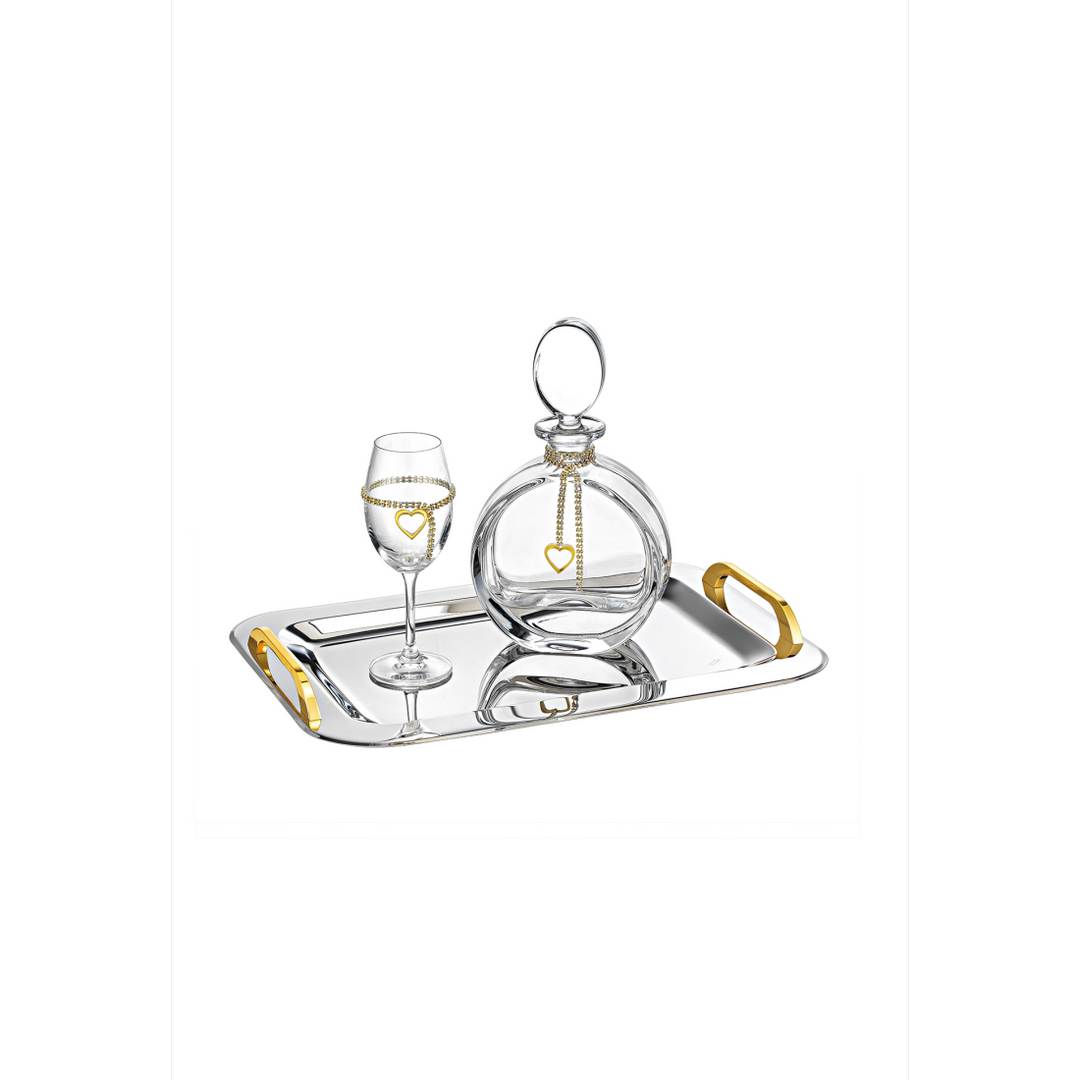 Το σετ κουμπάρου “Χρυσή Καρδιά” είναι ένα σύνολο που ξεχωρίζει με την όμορφη χρυσή καρδιά που στολίζει την κρυστάλλινη καράφα και το ποτήρι. Ο δίσκος, με την λαμπερή επιφάνεια και τις χρυσές λαβές, θα τραβήξει τα βλέμματα όλων. Η καράφα, με το στρογγυλό σχήμα και την αστραφτερή λάμψη, θα φιλοξενήσει το αγαπημένο σας ποτό. Το ποτήρι, με την λεπτή γραμμή και την αέρινη αίσθηση, θα ολοκληρώσει το σετ και θα προσθέσει μια πινελιά χάρης.