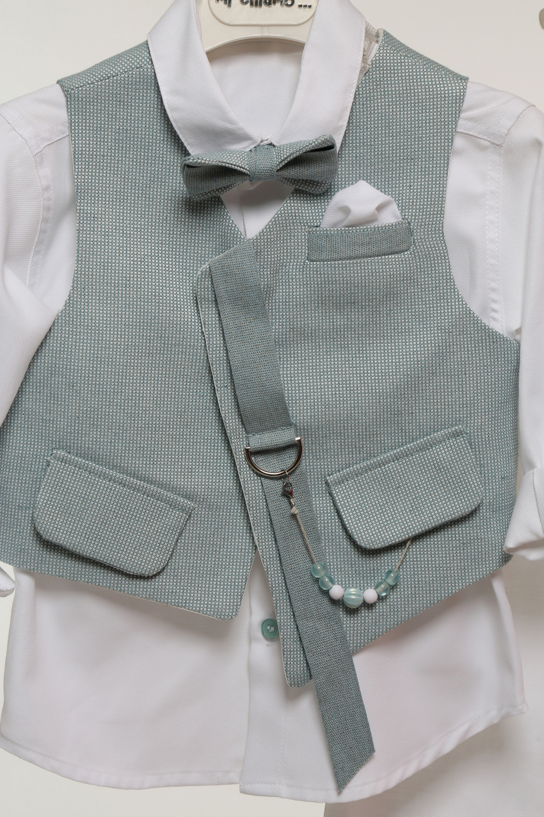 Κομψό βαπτιστικό σύνολο για αγόρι, σε εκρού και πράσινους τόνους, που συνδυάζει την κλασική φινέτσα με τη μοντέρνα αισθητική. Περιλαμβάνει πουκάμισο με διακριτικά σχέδια, γιλέκο με κομψές λεπτομέρειες, παντελόνι σε βαθύ πράσινο, καθώς και παπιγιόν, διακοσμητική αλυσίδα και ζώνη. Ιδανικό για μια ξεχωριστή εμφάνιση στη βάπτιση.