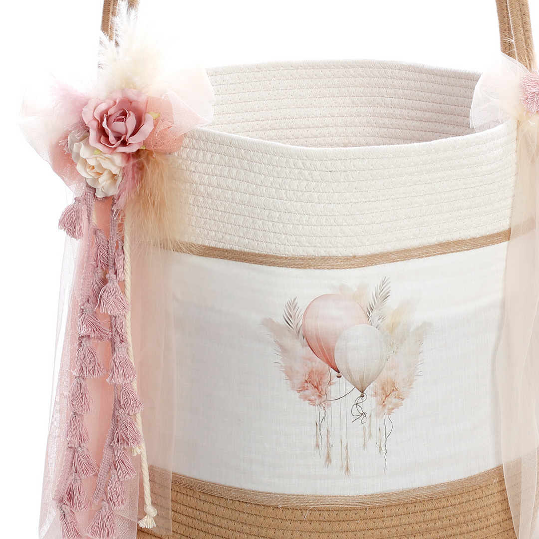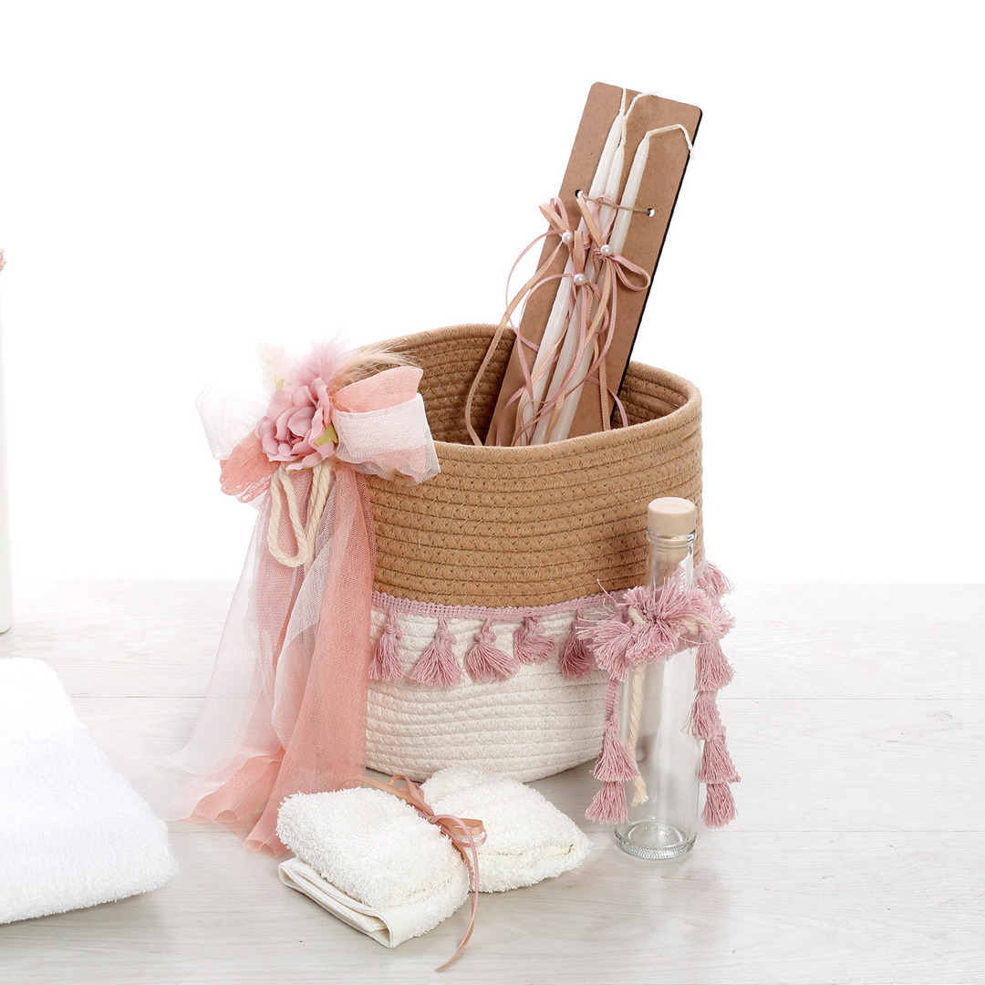 - Ένα ψάθινο καλάθι βάπτισης, διακοσμημένο με τουλίπες, ροζ τούλι και δαντέλα, που θα αποθηκεύσει με στυλ τα βαπτιστικά ρούχα.
