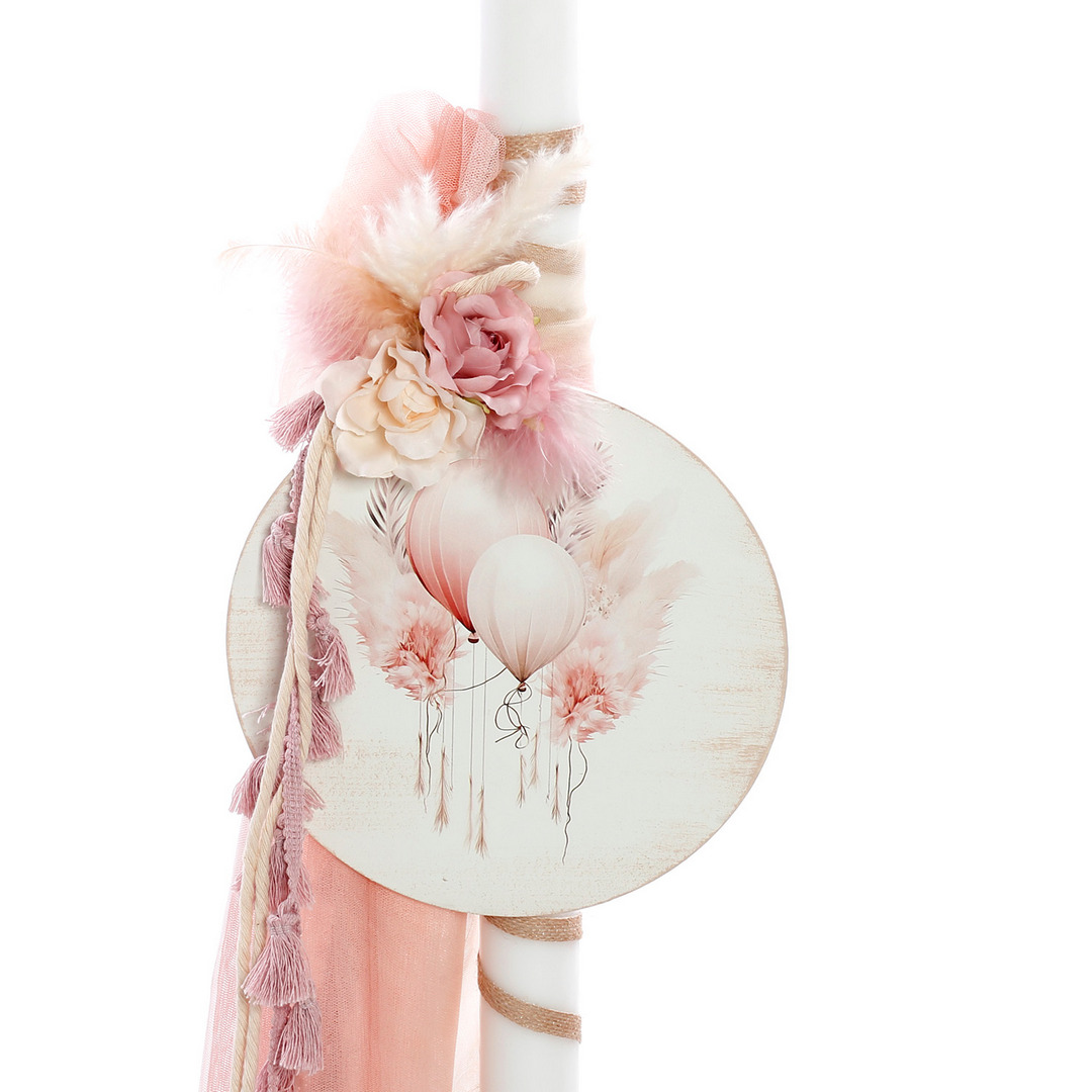 - Μια λαμπάδα βάπτισης με ασορτί διακόσμηση τουλίπας, ροζ τούλι και δαντέλα, που θα φωτίσει τη στιγμή της βάπτισης.