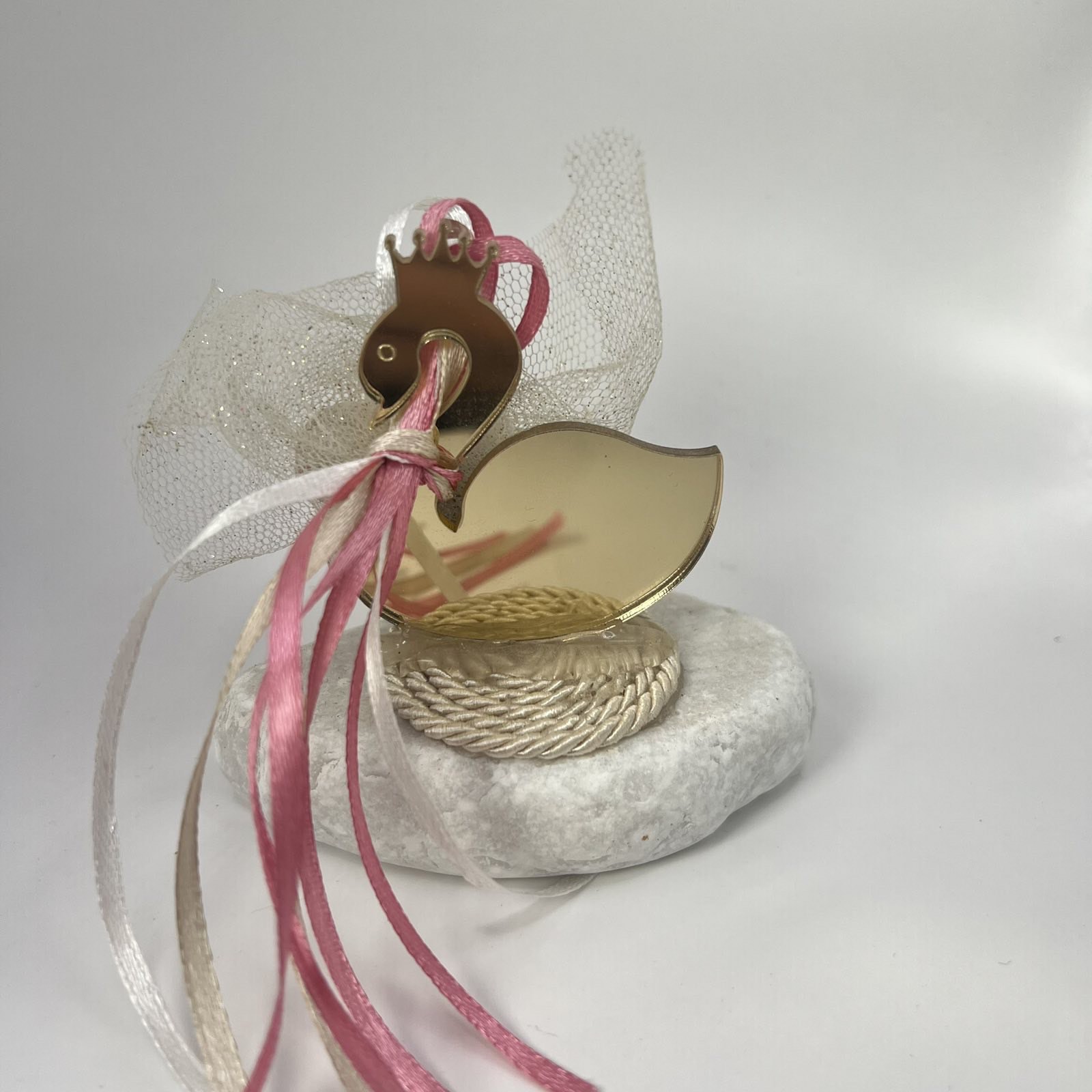 Μια μαγευτική μπομπονιέρα βάπτισης που αποπνέει κομψότητα και χάρη! Ο χρυσός κύκνος με τη βασιλική του κορωνίτσα συμβολίζει την ομορφιά και την αγνότητα, καθιστώντας το ιδανικό δώρο για τη βάπτιση της μικρής σας πριγκίπισσας. Στηρίζεται πάνω σε μια λευκή μαρμάρινη βάση, ενώ οι λεπτεπίλεπτες κορδέλες σε ροζ και ιβουάρ αποχρώσεις προσθέτουν ρομαντική αίσθηση. Ένα μοναδικό διακοσμητικό που οι καλεσμένοι σας θα κρατήσουν ως πολύτιμο αναμνηστικό της ξεχωριστής αυτής ημέρας.