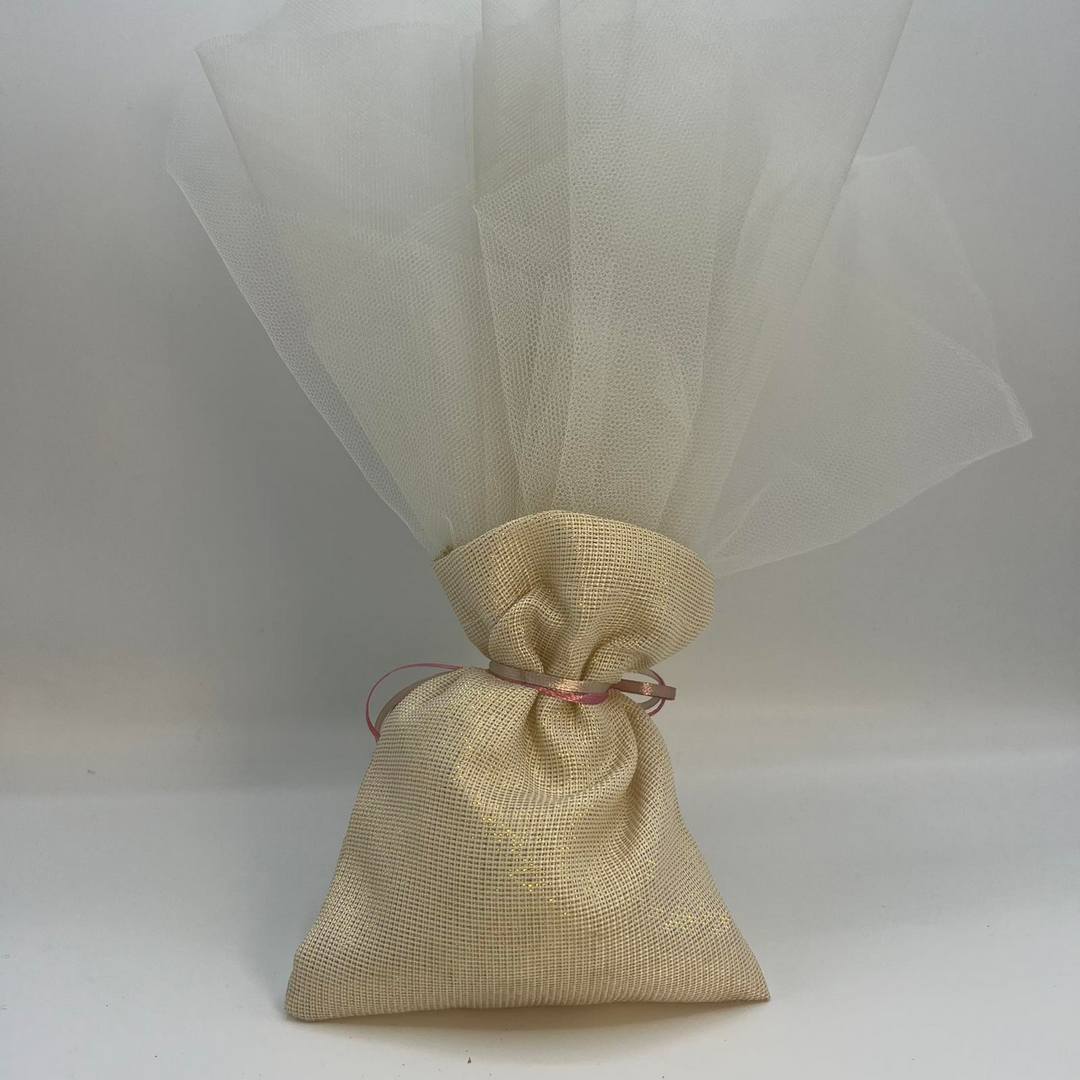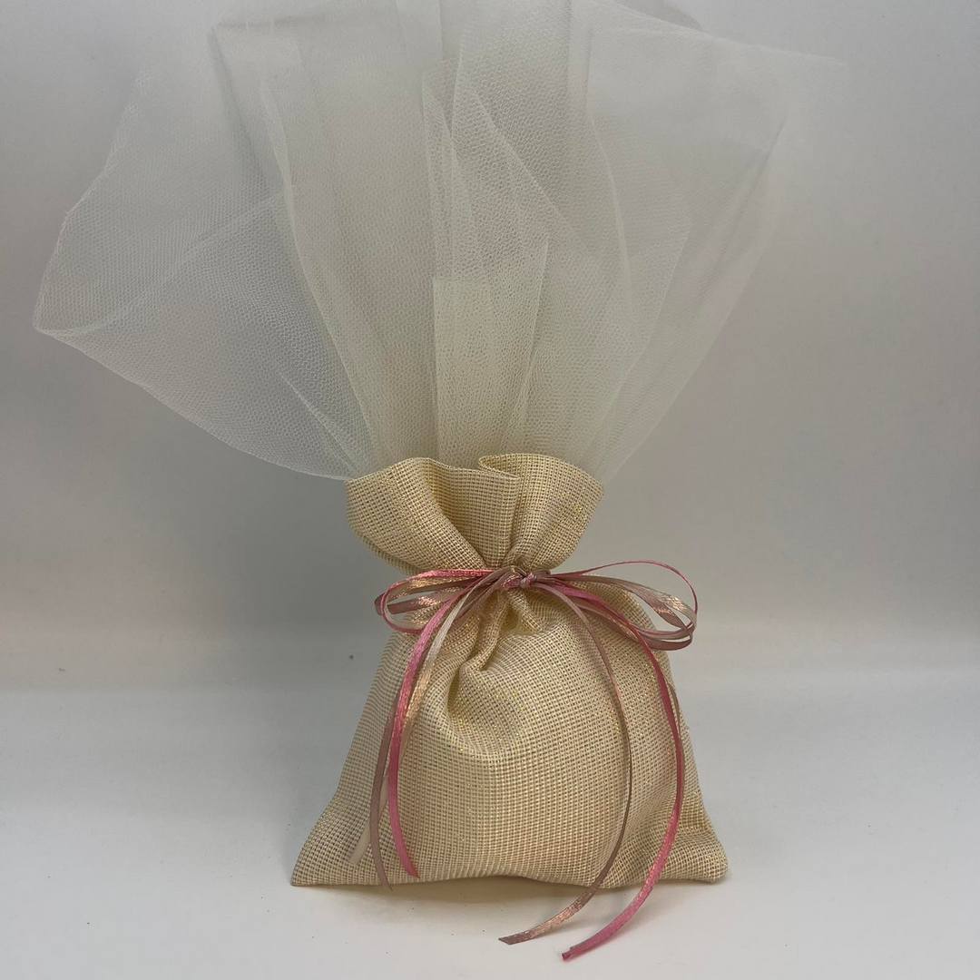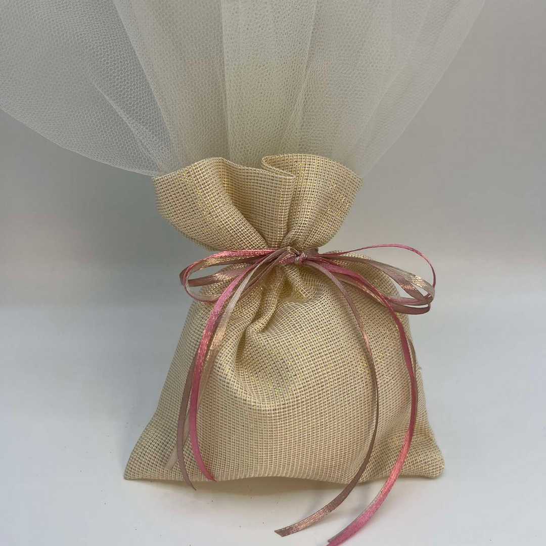 Μια πανέμορφη και ρομαντική μπομπονιέρα γάμου που συνδυάζει την κομψότητα του τούλιου με τη διαχρονική φινέτσα ενός πουγκιού. Το τούλι προσθέτει αέρινη αίσθηση και λεπτότητα, ενώ το πουγκί δημιουργεί μια πιο σταθερή και εντυπωσιακή βάση. Στο κέντρο, λεπτές κορδέλες σε αρμονικά χρώματα δένουν τη σύνθεση και σχηματίζουν έναν υπέροχο φιόγκο, χαρίζοντας μια διακριτική πολυτέλεια. Ιδανική επιλογή για έναν γάμο με ρομαντική και κομψή αισθητική, αυτή η μπομπονιέρα θα εντυπωσιάσει τους καλεσμένους σας και θα μείνει ως ένα ξεχωριστό αναμνηστικό της όμορφης ημέρας σας