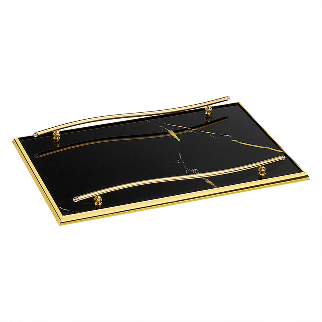 - Σχήμα και Υλικά: Ορθογώνιος, με μαύρη επιφάνεια που μιμείται την υφή του μαρμάρου, με λεπτές χρυσαφί γραμμές που διατρέχουν την επιφάνεια. Το περίγραμμα είναι μεταλλικό, πιθανότατα από ορείχαλκο ή επιχρυσωμένο μέταλλο, με γυαλιστερή επιφάνεια. Οι λαβές είναι επίσης μεταλλικές, χρυσές, με κυματιστό σχήμα, προσδίδοντας μια αίσθηση ρευστότητας και σύγχρονης κομψότητας.