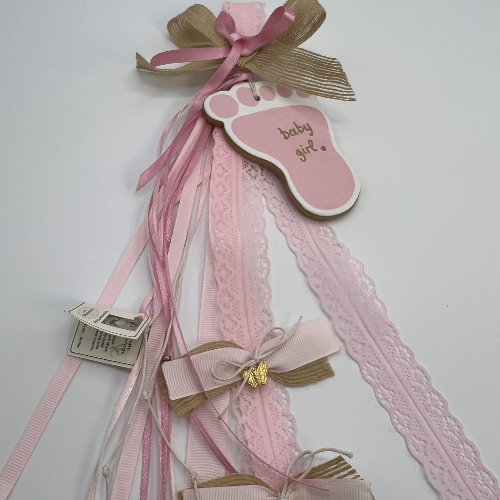 Αυτή το υπέροχο κρεμαστό γεννητούρι για κορίτσι είναι φτιαγμένη σε ζεστές, ρομαντικές αποχρώσεις της άμμου, του ροζ και του σάπιου μήλου, δημιουργώντας μια αίσθηση γλυκύτητας και κομψότητας. Το κεντρικό της στοιχείο είναι ένα χειροποίητο πήλινο πατουσάκι, με απαλή υφή και φυσικό φινίρισμα, στο οποίο είναι χαραγμένη ή ζωγραφισμένη η φράση “Baby Girl”, κάνοντάς το ένα ιδιαίτερο αναμνηστικό που αποτυπώνει την τρυφερότητα των πρώτων στιγμών του μωρού.
