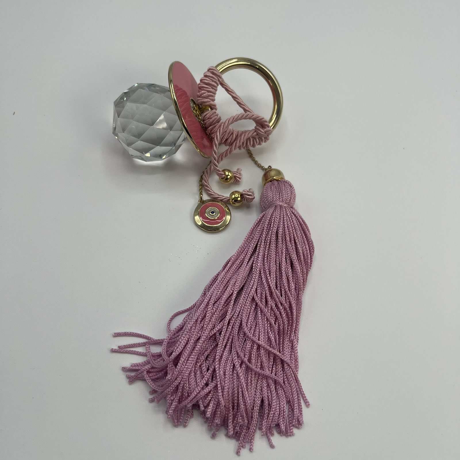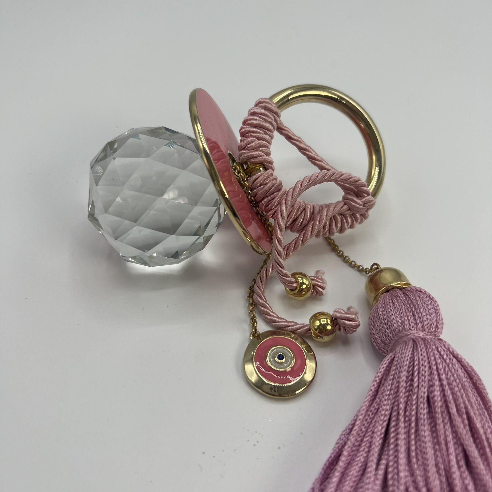 Αυτή η φωτογραφία παρουσιάζει ένα διακοσμητικό αντικείμενο, πιθανώς ένα μπρελόκ ή ένα διακοσμητικό για τσάντα, το οποίο συνδυάζει διάφορα υλικά και χρώματα. Στο επίκεντρο της εικόνας βρίσκεται μια διάφανη σφαίρα από κρύσταλλο, η οποία αντανακλά το φως και προσδίδει μια αίσθηση πολυτέλειας. Η σφαίρα αυτή συνδέεται με έναν χρυσό κρίκο, ο οποίος με τη σειρά του συνδέεται με μια ροζ, στρογγυλή βάση. Στη βάση αυτή, διακρίνεται ένα μικρότερο ροζ στοιχείο με ένα μικρό διακοσμητικό στο κέντρο του, που μοιάζει με μάτι. Ίσως πρόκειται για το σύμβολο του “ματιού”, το οποίο θεωρείται ότι προστατεύει από την κακή τύχη.