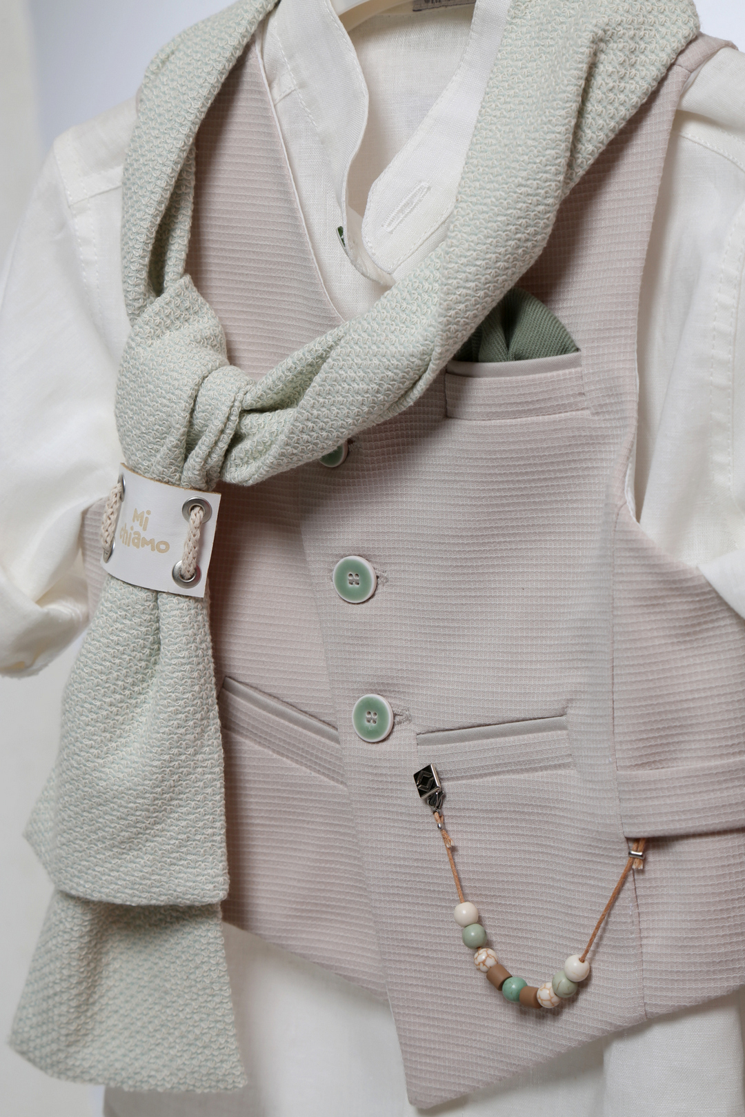 Ένα κομψό και άνετο βαπτιστικό σύνολο για αγόρι με boho chic έμπνευση. Αποτελείται από ένα γιλέκο σε μπεζ απόχρωση με διακριτική υφή, ένα λευκό πουκάμισο, ένα πασμίνα σε γκρι-πράσινη απόχρωση και ένα λαδί παντελόνι.